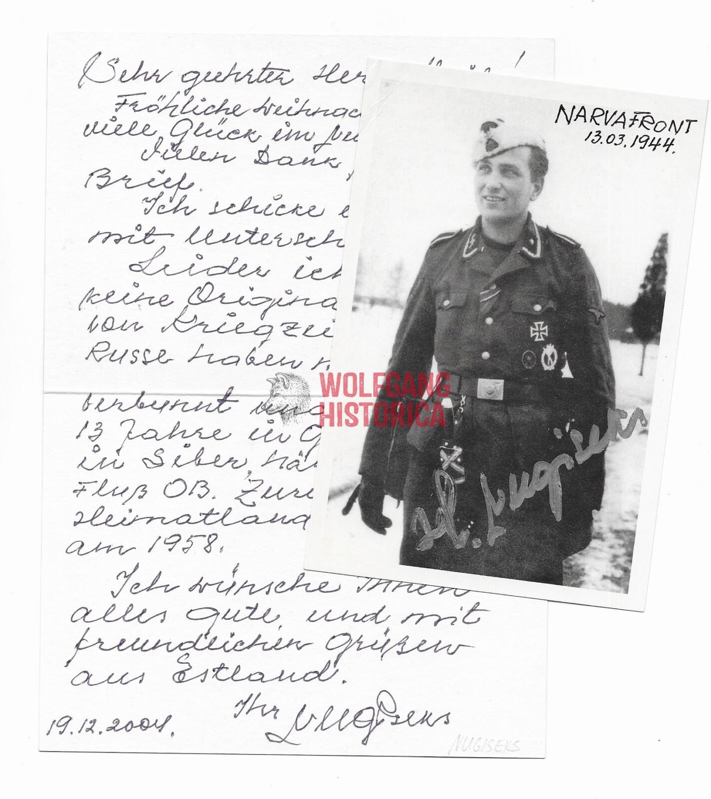 Original Postwar Signature on a Postwar Photo of Harald Nugiseks. Waffen-Oberscharführer Harald Nugiseks (22.10.1921 † 02.01.2014) earned the Ritterkreuz on April 9, 1944 as Waffen-Unterscharführer und Zugführer in the 1. Kompanie/ SS-Freiwilligen-Grenadier-Regiment 46 of the 20. Waffen-Grenadier-Division der SS (estnische Nr. 1). Good condition. Postcardsize. Comes with an extra signed postcard.