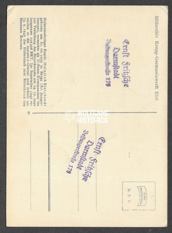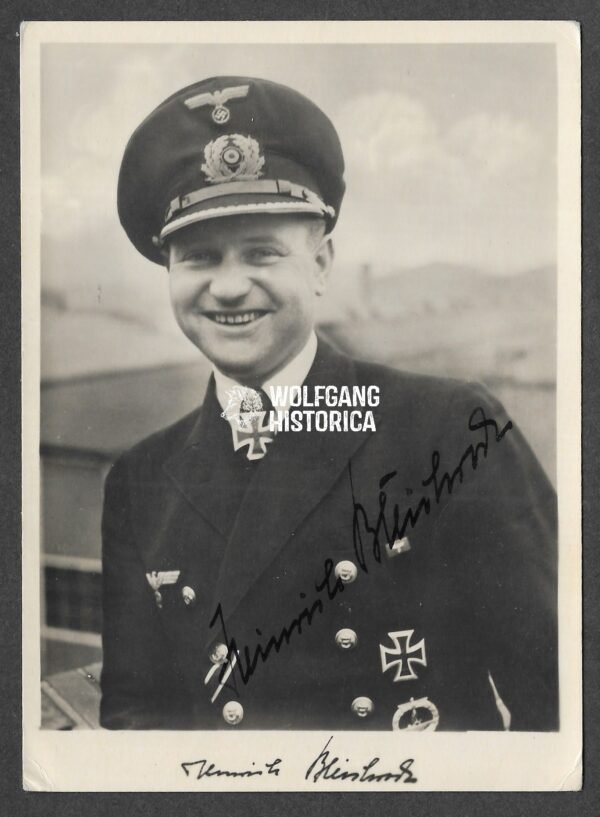 Heinrich Bleichrodt ranks among the most successful U-boat commanders of the Kriegsmarine, credited with over 200,000 GRT of enemy shipping sunk. His autograph on wartime material is scarce and highly desirable, especially with traceable period provenance.