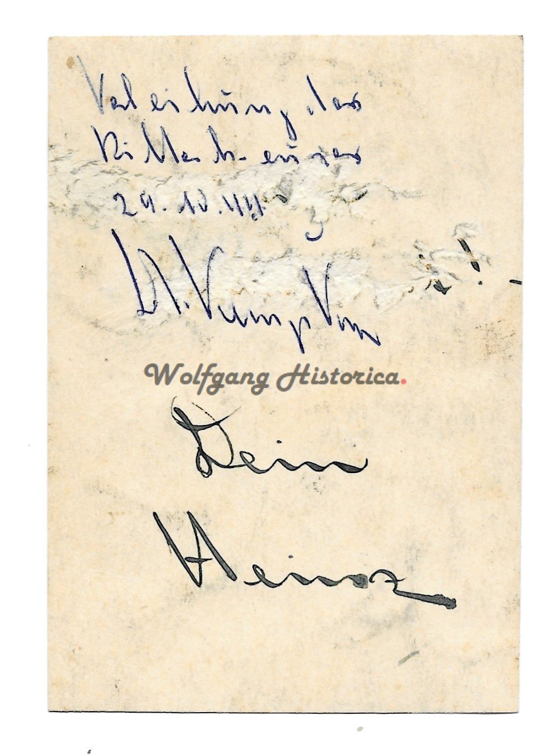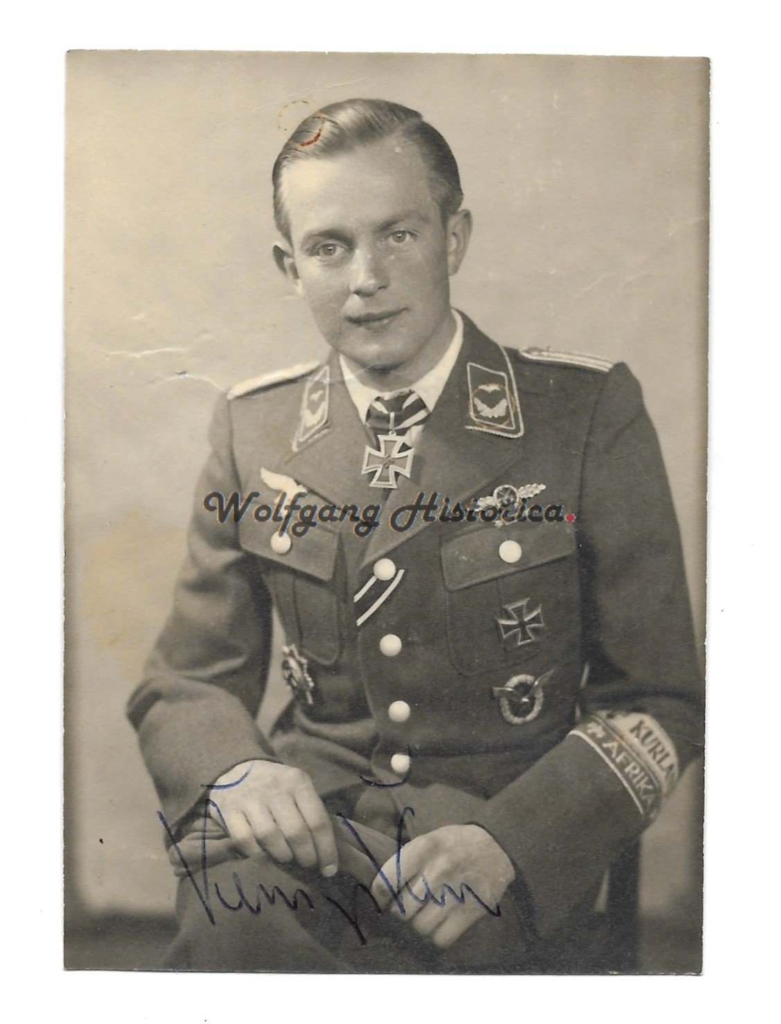 Original Wartime Portrait of Oberleutnant Heinrich Kempken (18.06.1920 † 15.11.2006), who earned the Ritterkreuz on October 29, 1944 as Fahnenjunker-Feldwebel of the 7. Staffel/ Schlachtgeschwader 3. Good condition. Measuring: 11x8cm. Signed postwar on the front and wartime on the back (‘Dein Heinz’).
