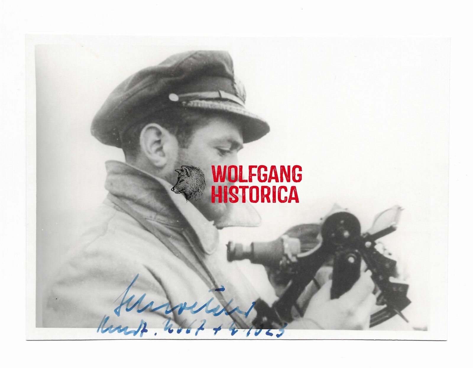 Original Postwar Signature on a Postwar Photo of Heinrich Schroeteler. Käpitanleutnant Heinrich Schroeteler (10.12.1915 in Essen-Katernberg † 19.01.2000 in Bochum) earned the Ritterkreuz des Eisernen Kreuzes on May 2, 1945 as Kapitänleutnant und Kommandant of Uboot “U-1023”.