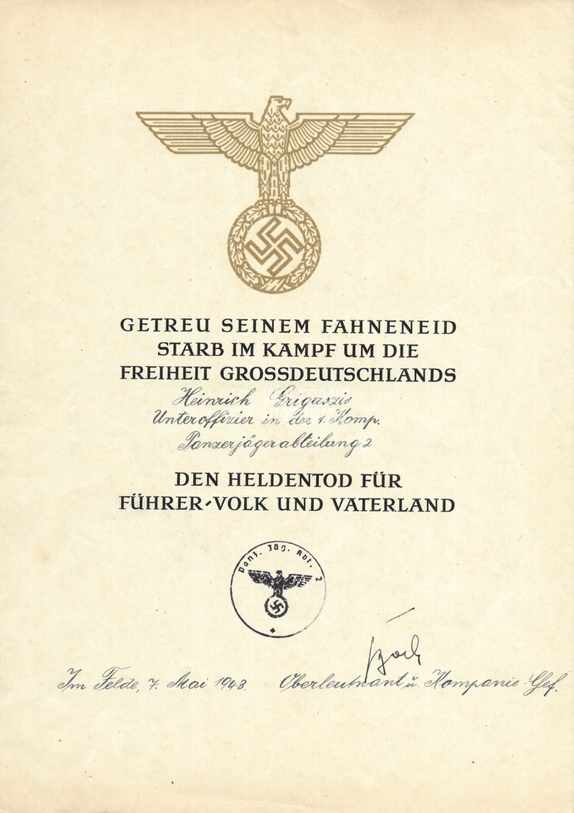 Original “Heldentod Ehrenurkunde” / “Gedenkblatt” (“Hero’s Death honor document”), which given to family member’s of a soldier who was Killed in Action. This document is honored to Unteroffizier Heinrich Griguszis, who served with the 1. Kompanie/ Panzerjäger-Abteilung 2 of the 12. Panzer-Division. Condition as seen. A4 size.