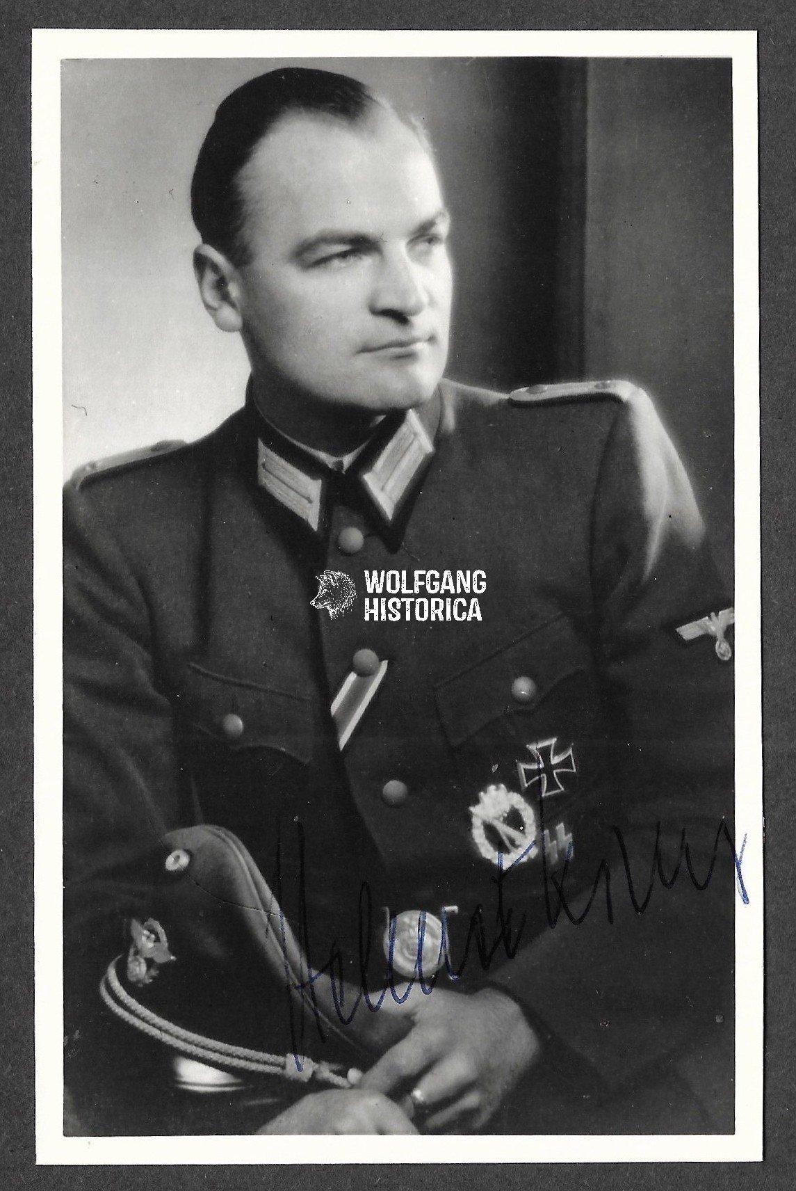 Original Scarce Postwar Signature on a Postwar Photo of Helmut Kinz. SS-Sturmbannführer und Major der Schutzpolizei Helmut Kinz (1 December 1915, Nagykanizsa † 19 October 1985, Klagenfurt) was a Waffen-SS and police officer who rose to the rank of SS-Sturmbannführer and Major of the Schutzpolizei during the Second World War. He is best remembered as the last commander of the Waffen-Gebirgs-Aufklärungs-Abteilung 13, the reconnaissance battalion of the 13. Waffen-Gebirgs-Division der SS “Handschar” (kroatische Nr. 1). For his leadership in the final days of the war, he was awarded the Knight’s Cross of the Iron Cross.