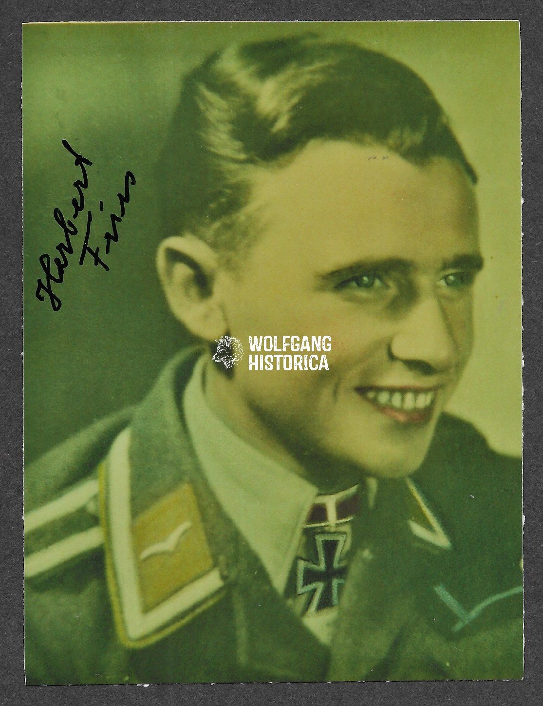 Herbert Fries is remembered as one of the notable anti-tank fighters of the Luftwaffe’s ground formations. His signature is scarce compared to other Ritterkreuzträger, particularly on large-format photos such as this example. An impressive and historically rich autograph, highly desirable for collectors of Fallschirmjäger and anti-tank warfare memorabilia.