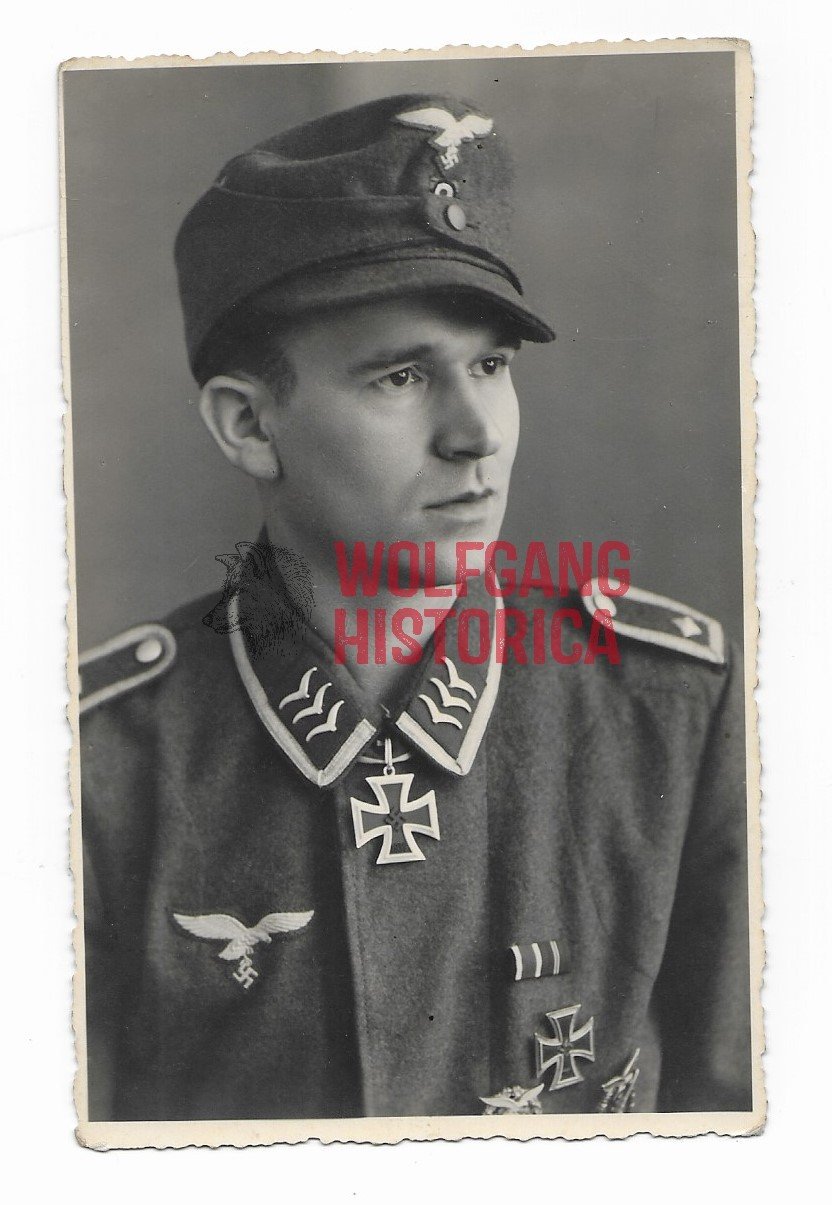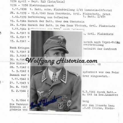 Original Wartime Studioportrait of Herbert Schneider. Oberwachtmeister Herbert Schneider (31.07.1915 † 01.12.2011) earned the Ritterkreuz on February 5, 1944 as Wachtmeister und Flakkampftruppführer of the 6. Batterie/ Flak-Regiment 49. Good condition. Measuring: Postcardsize.