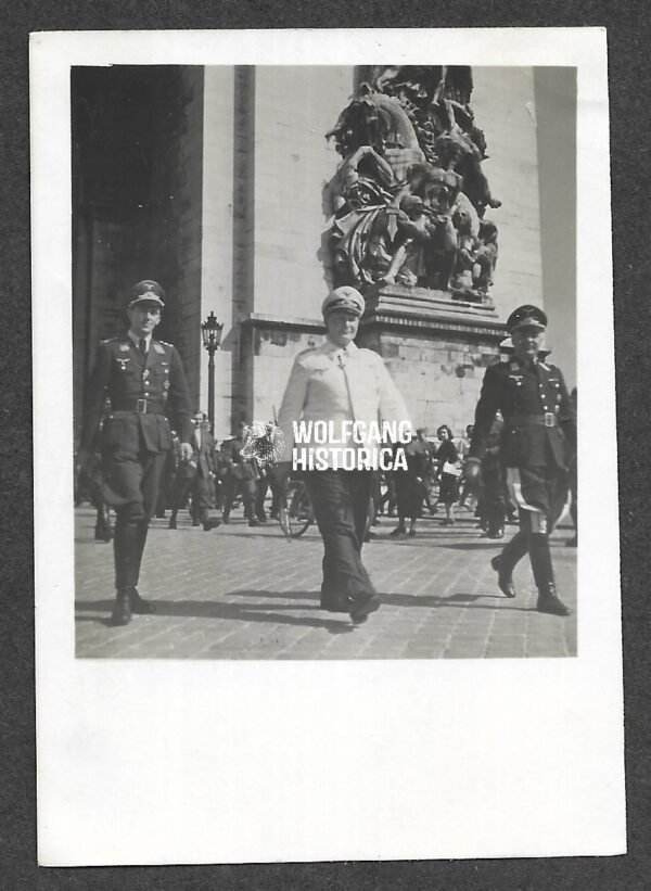 Original period photograph showing Reichsmarschall Hermann Göring walking with Luftwaffe officers in front of the Arc de Triomphe, Paris. The image captures Göring wearing a light-colored summer uniform, accompanied by officers in dark Luftwaffe dress. The monument’s sculptural relief (“La Marseillaise” by François Rude) is clearly visible in the background.