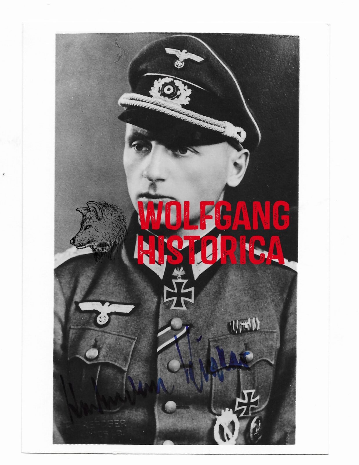 Original Postwar Signature on a Postwar Photo of Hermann Kiefer. Oberleutnant Hermann Kiefer (09.09.1912 in Lörrach † 22.01.2006 in Denzlingen) earned the Ritterkreuz des Eisernen Kreuzes on April 5, 1945 as Oberleutnant und stellvertretender Kommandeur of the Kampfgruppe XII/2.