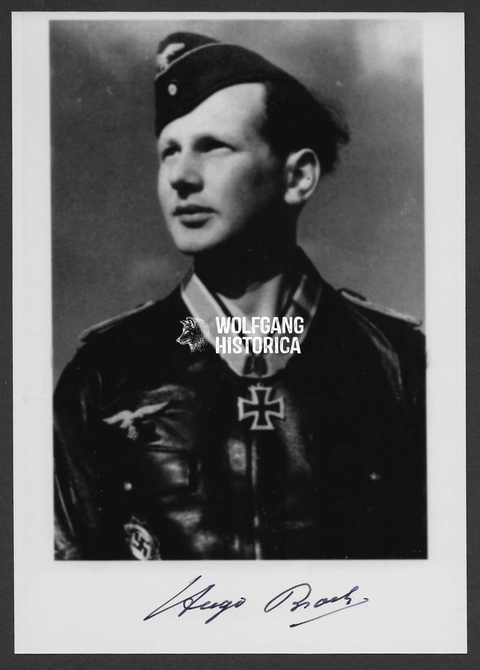Original Postwar Signature on a Postwar Photo of Hugo Broch. Feldwebel Hugo Broch (06.01.1922 †) earned the Deutsches Kreuz in Gold on October 17, 1943 and the Ritterkreuz des Eisernen Kreuzes on March 12, 1945 as Feldwebel in the 8. Staffel/ Jagdgeschwader 54. Condition as seen. Large Size (A5!).