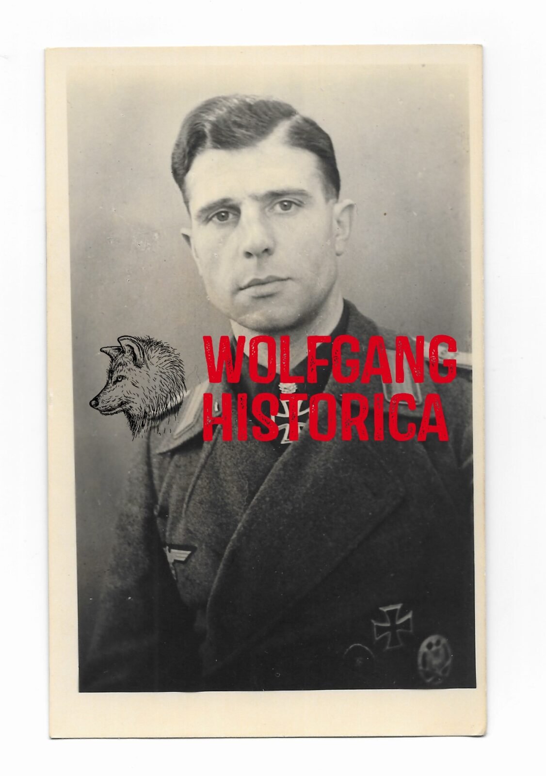 Original Wartime Studioportrait of Hugo Primozic. Oberleutnant Hugo Primozic (16.02.1914 † 18.03.1996) earned the Ritterkreuz on September 19, 1942 as Wachtmeister und Zugführer of the 2. Batterie/ Sturmgeschütz-Abteilung 667 and the Eichenlaub on January 25, 1943 as Oberwachtmeister und Zugführer of the 2. Batterie/ Sturmgeschütz-Abteilung 667. Good condition.