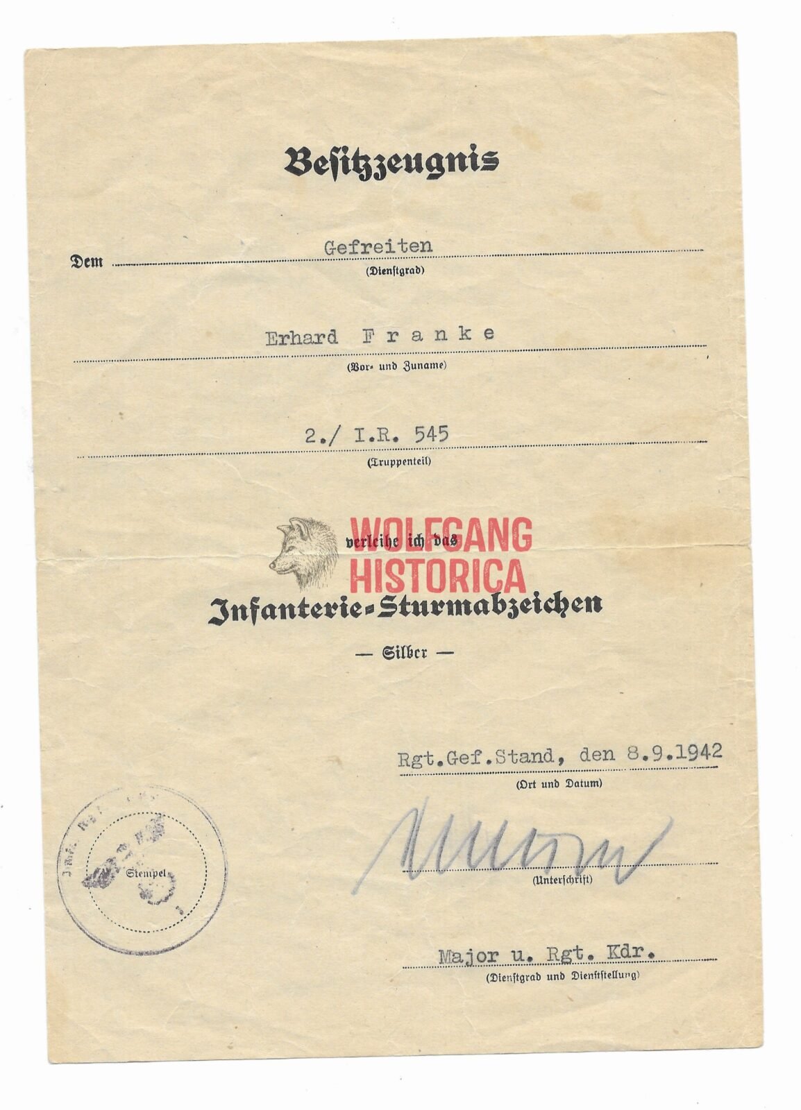 Award document of Gefreiter Erhard Franke, who served with the 2. Kompanie/ Grenadier-Regiment 545 of the 389. Infanterie-Division for the Infanterie-Sturmabzeichen in Silber (Infantry Assault Badge in Silver) on September 8, 1942 during the Battle for Stalingrad for 3 infantry assault days during his service! Document was signed by Major Wilhelm Knetsch (DKIG & RK IN STALINGRAD!). Paulus said that Knetsch was the best battalion commander in his entire army! Has been folded in the past.