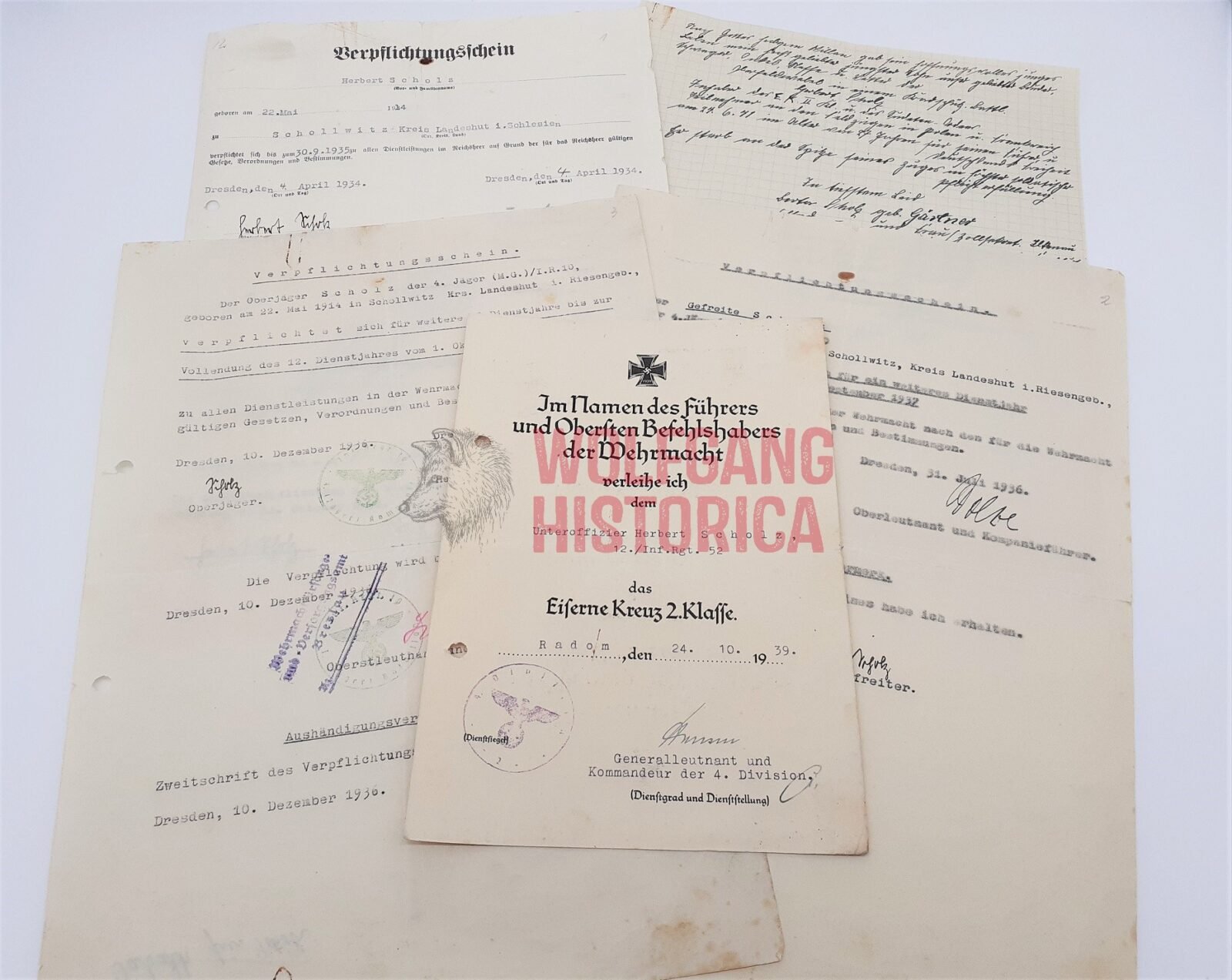 Award document for Eisernes Kreuz 2. Klasse (Iron Cross 2nd Class) for his heroic service on October 24, 1939, while serving with 12. Kompanie/ Infanterie-Regiment 52 of the 4. Infanterie-Division which was signed by Generalleutnant Erich Hansen (Knight’s Cross). Signed at Radom, Poland! Interesting award document for the Polish campaign. Comes with a few extra documents. Herbert Scholz was later Killed in Action! Good condition.