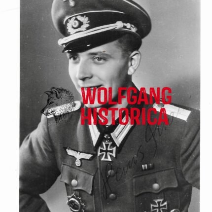 Original Postwar Signature on a Postwar Photocopy of Johann Hörstermann. Major Johann Hörstermann (30.05.1911 † 25.03.1992) earned the Deutsches Kreuz in Gold on November 13, 1942 with 6. Kompanie/ Infanterie-Regiment 473 and the Ritterkreuz on March 28, 1945 as Major und Kommandeur of Grenadier-Regiment 473 of the 253. Infanterie-Division. Good Condition. Measuring: Postcardsize. Comes with an extra signed letter.