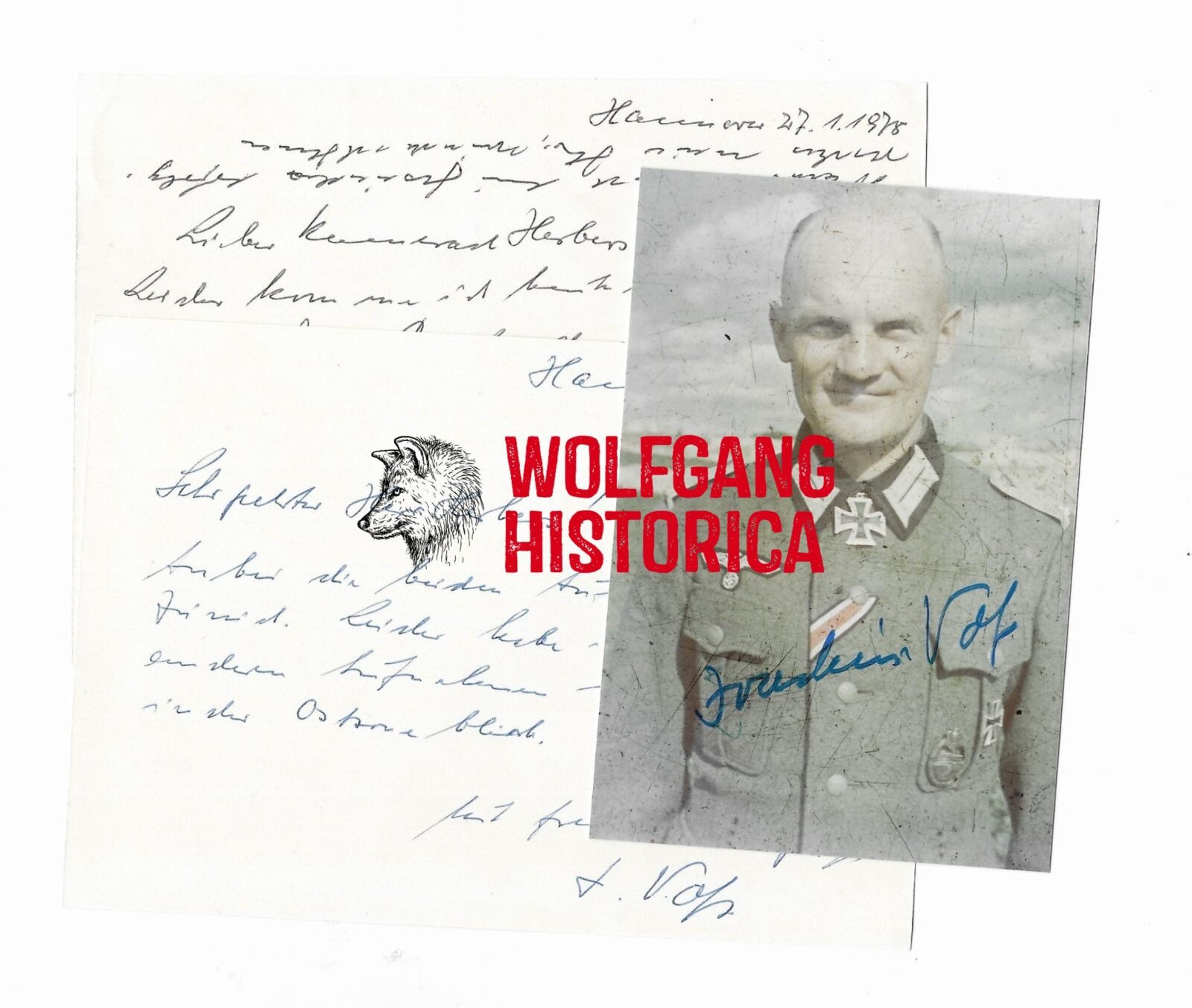 Original Postwar Signature on a Postwar Photo plus Cards of Johann-Joachim Voß. Oberleutnant Johann-Joachim Voß (03.09.1910 † 10.03.1982) earned the Ritterkreuz des Eisernen Kreuzes on May 27, 1942 as Oberleutnant und Führer of the 5. Kompanie/ Schützen-Regiment 93 of the 13. Panzer-Division.