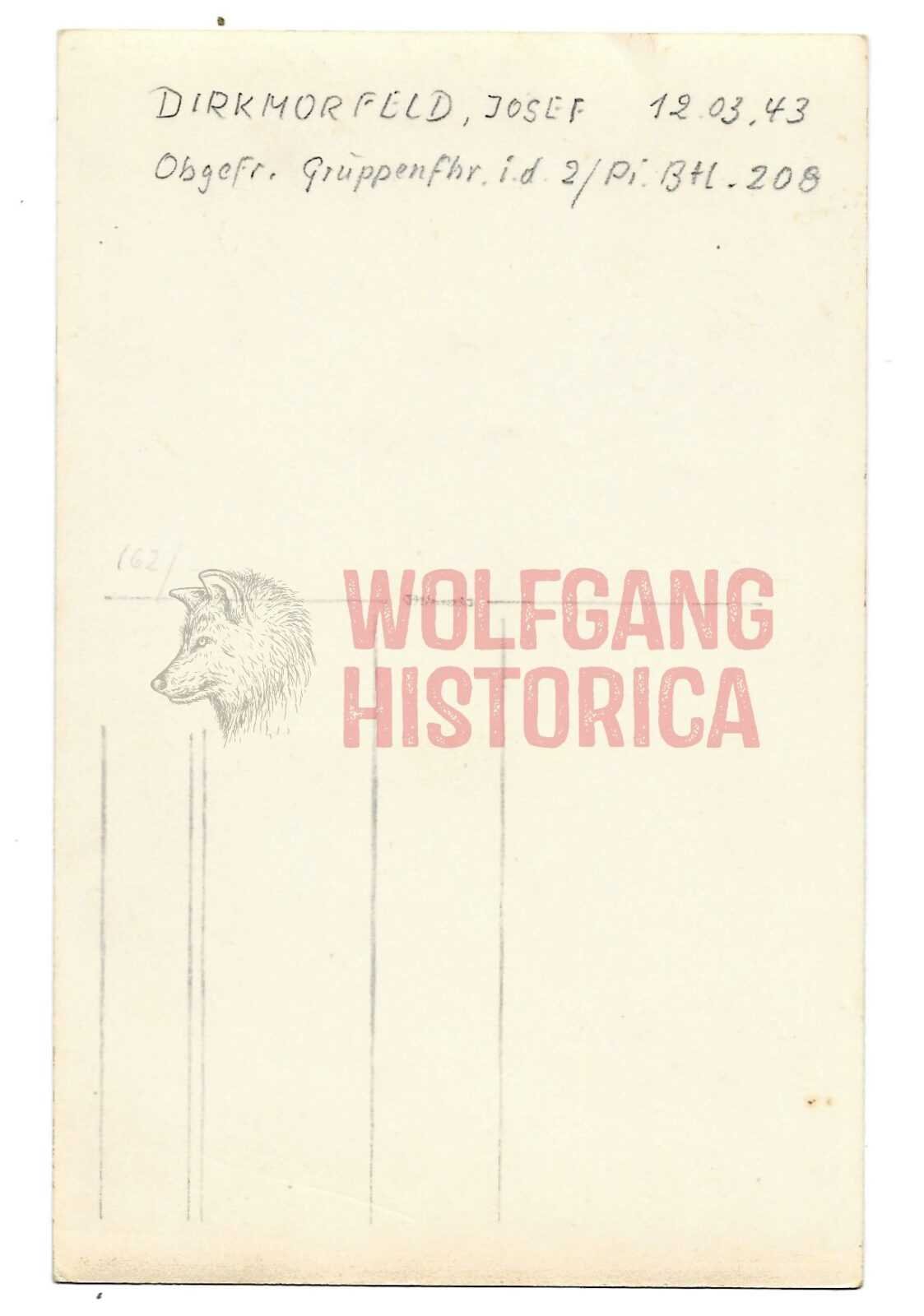 Wartime Signed Studioportrait of Obergefreiter Josef Dirkmorfeld (04.05.1912 † 20.03.1990) who earned the Ritterkreuz des Eisernen Kreuzes on March 12, 1943 as Obergefreiter u. Gruppenführer in the 2. Kompanie/ Pionier-Bataillon 208 of the 208. Infanterie-Division. Measuring: Postcardsize.