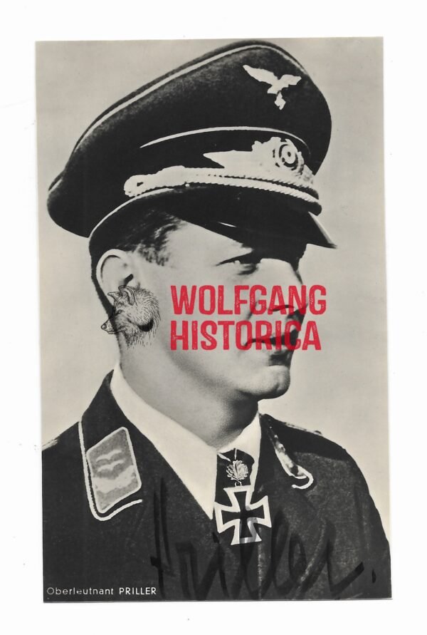 Original Wartime Signature on a Postcard of Josef “Pips” Priller. Oberst Josef “Pips” Priller (27.06.1915 † 20.05.1961) earned the Ritterkreuz des Eisernen Kreuzes on October 19, 1940 as Oberleutnant und Staffelkapitän with 6. Staffel/ Jagdgeschwader 51, the Eichenlaub on July 20, 1941 as Oberleutnant und Staffelkapitän of the 1. Staffel/ Jagdgeschwader 51 and the Schwertern on July 2, 1944 as Oberstleutnant und Kommodore of Jagdgeschwader 26 “Schlageter”. Good condition. Edges have been cut.