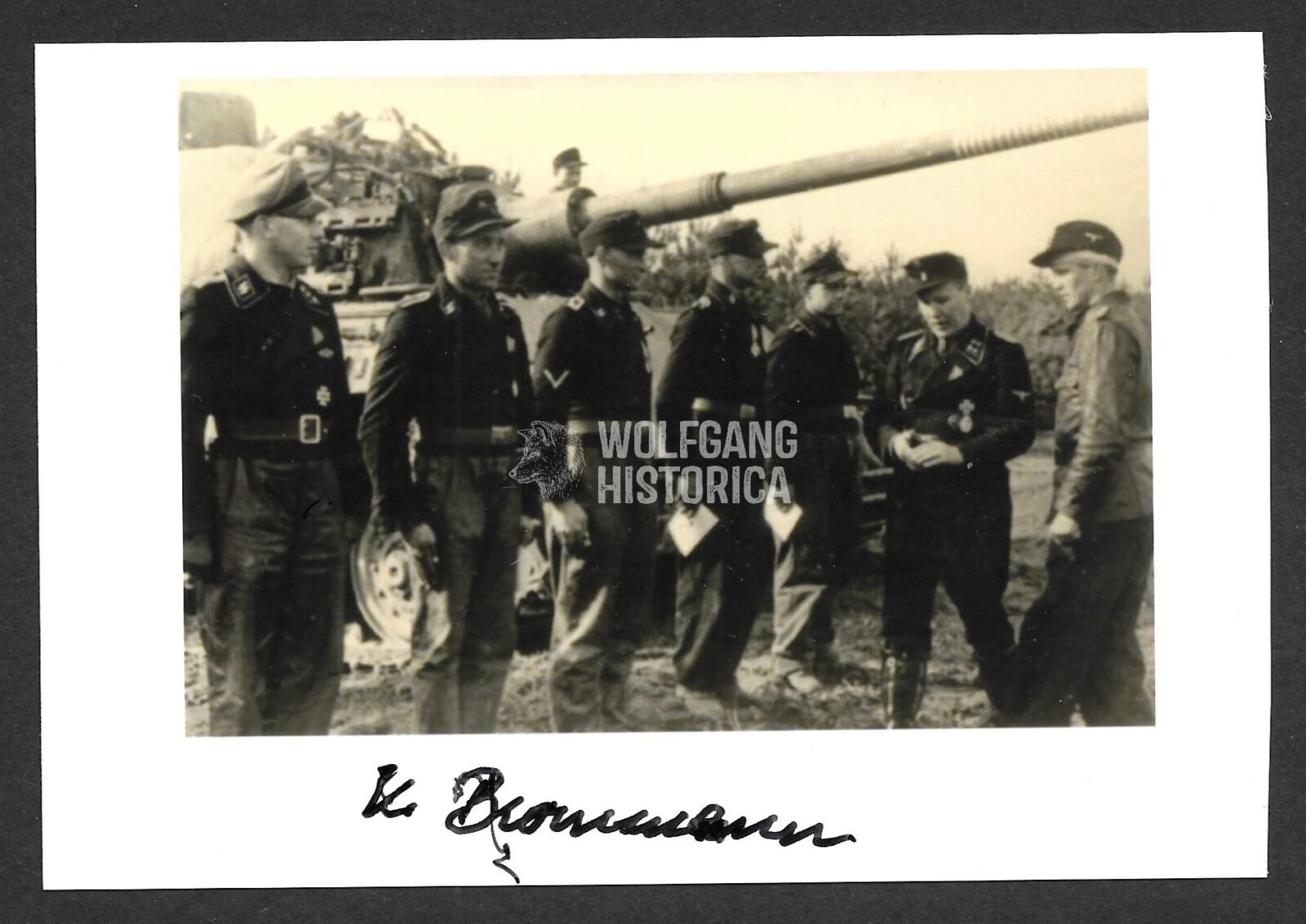 Original Postwar Signature on a Postwar Photo of Karl Brommann. SS-Untersturmführer Karl Brommann (20.07.1920 in Neumünster † 30.06.2011 in Dithmarschen) earned the Ritterkreuz des Eisernen Kreuzes on April 29, 1945 as SS-Untersturmführer and Führer of the 1. Kompanie/ schwere SS-Panzer-Abteilung 503. Good condition. Postcardsize.