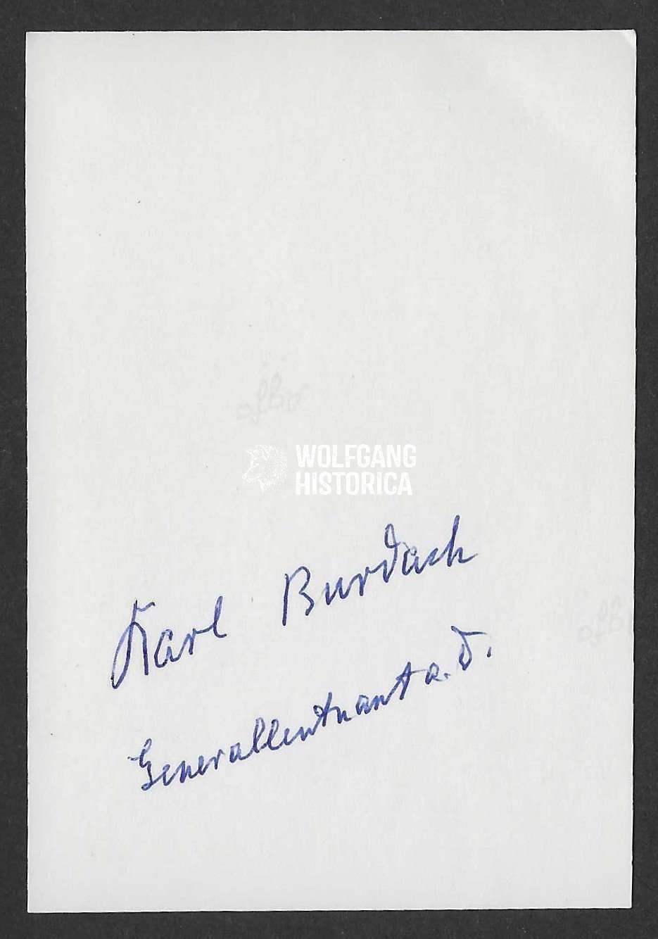 Original Postwar Signature on a Postwar Photo of Karl Burdach. Generalleutnant Karl Burdach (28.07.1891 † 30.12.1976) served as a General in the German Wehrmacht during the Second World War. He was awarded the Deutsches Kreuz in Gold on December 26, 1941 as Generalmajor und Kommandeur of the 251. Infanterie-Division and the Ritterkreuz des Eisernen Kreuzes on February 23, 1944 as Generalleutnant und Kommandeur of the 11. Infanterie-Division. Size: 7,5x10x5cm. Condition as seen. Signed on the reverse.