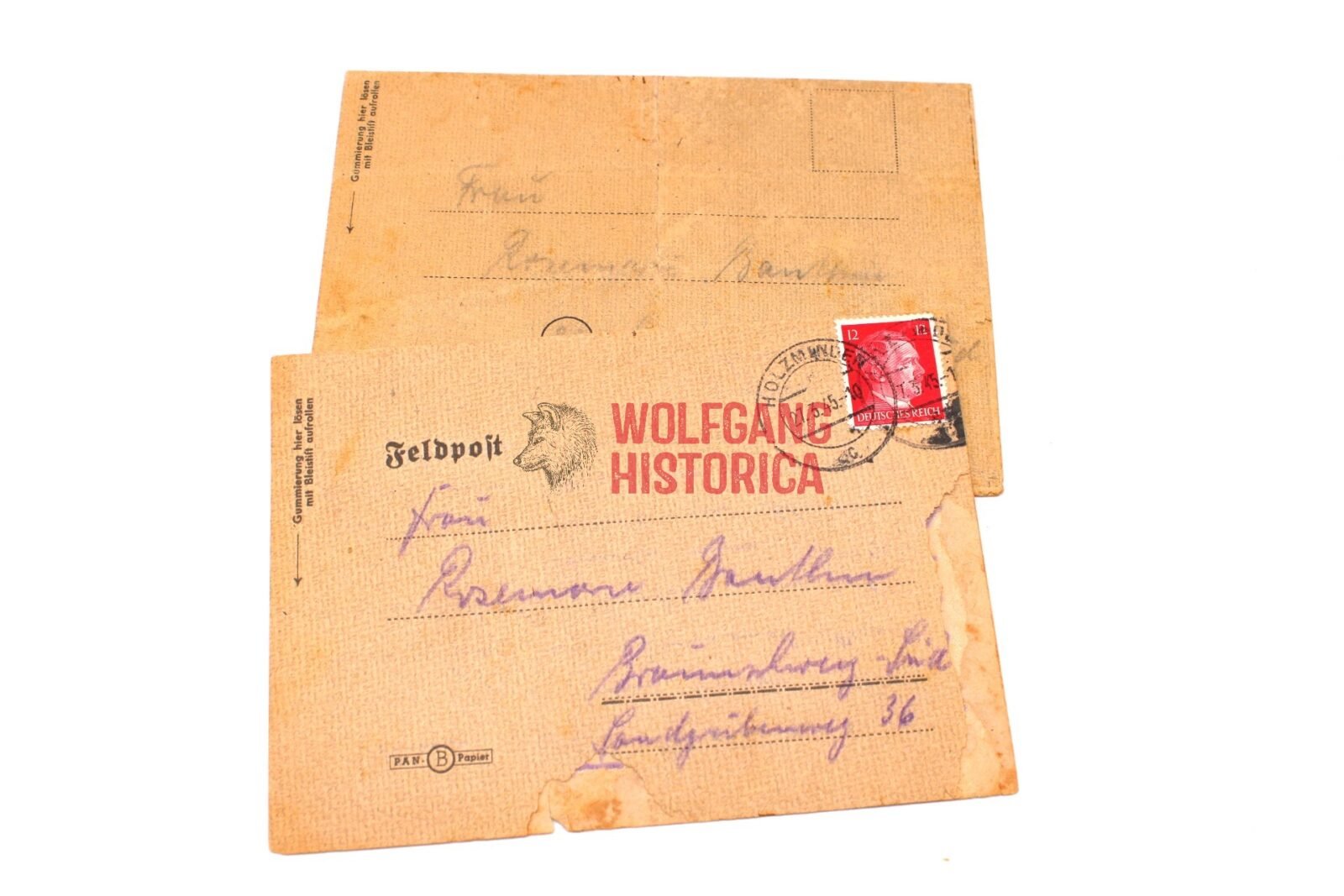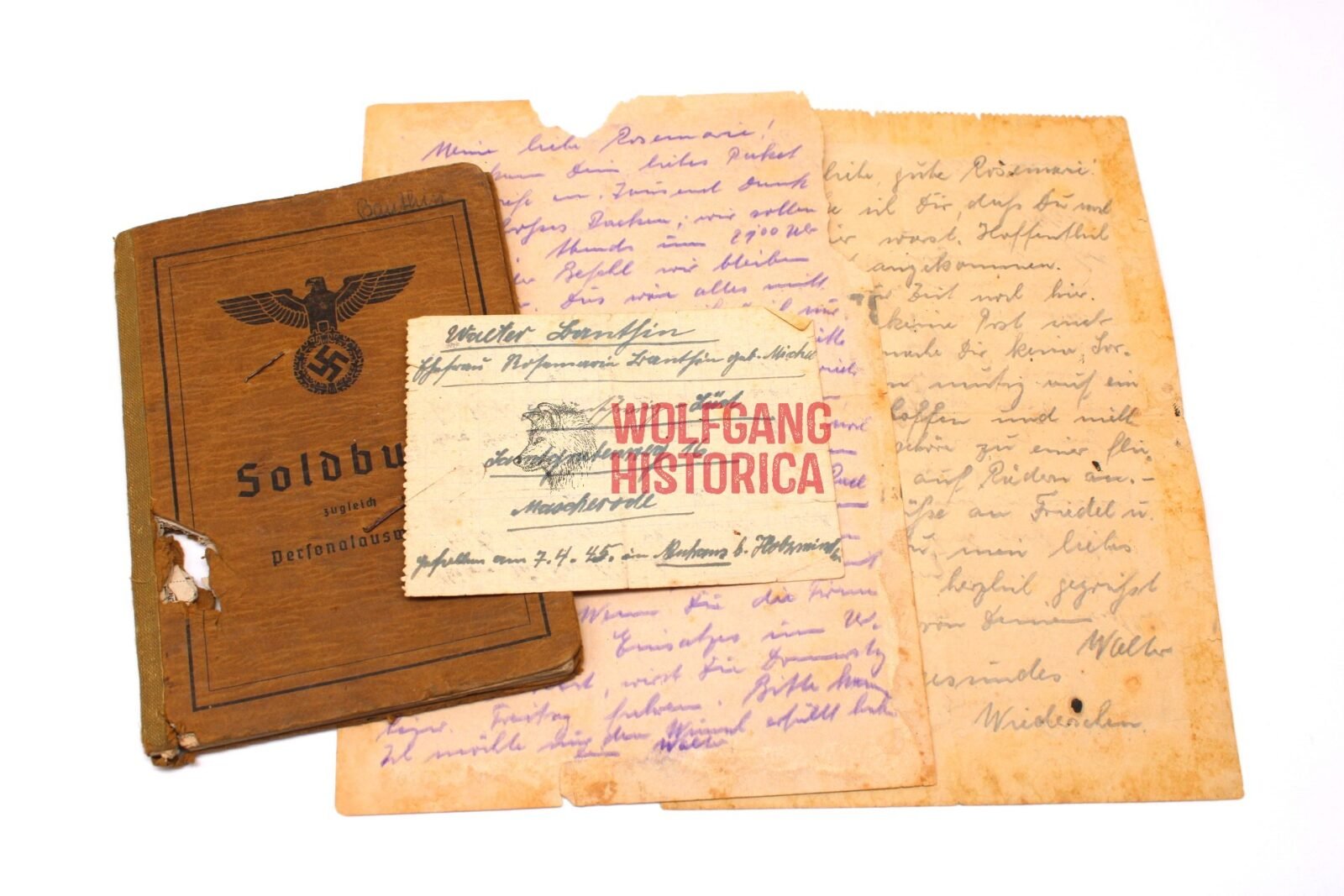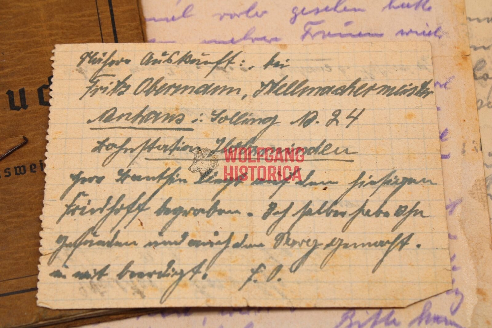 Original Soldbuch & 2 Feldpost letters of Walter Banthin, born on December 1, 1909 in Hannover. Soldbuch was opened on August 31, 1944 by the Panzer-Pionier-Ersatz und Ausbildungs-Bataillon 19. He wore the Erkennungsmarke: -1516- Pz.Pi.Ers.u.Ausb.Btl.19. Pionier Walter Banthin was Killed in Action on April 7 / 9, 1945. Walter Banthin ruht auf der Kriegsgräberstätte in Einbeck – Salzderhelden, Kriegsgräberstätte . Endgrablage: Reihe 6 Grab 4. Volksbund notes his date of death as April 9 but the small piece of paper notes his date of death as April 7 and Killed at Neuhaus near Holzminden.