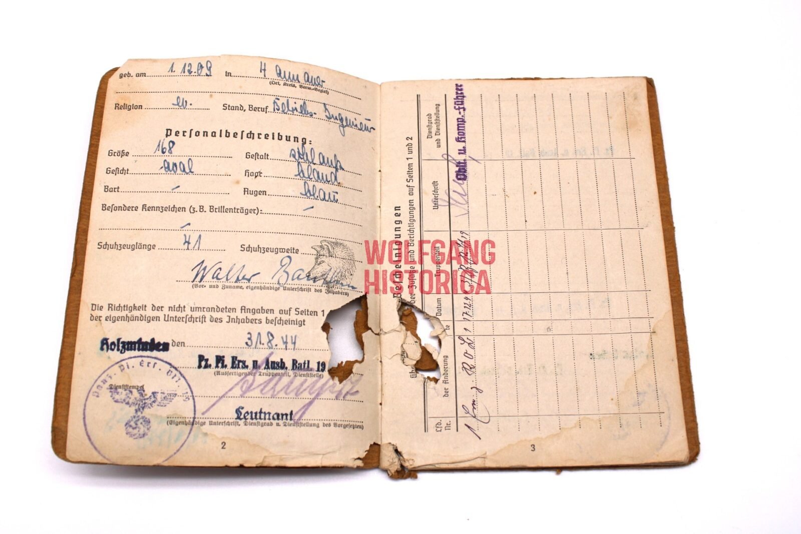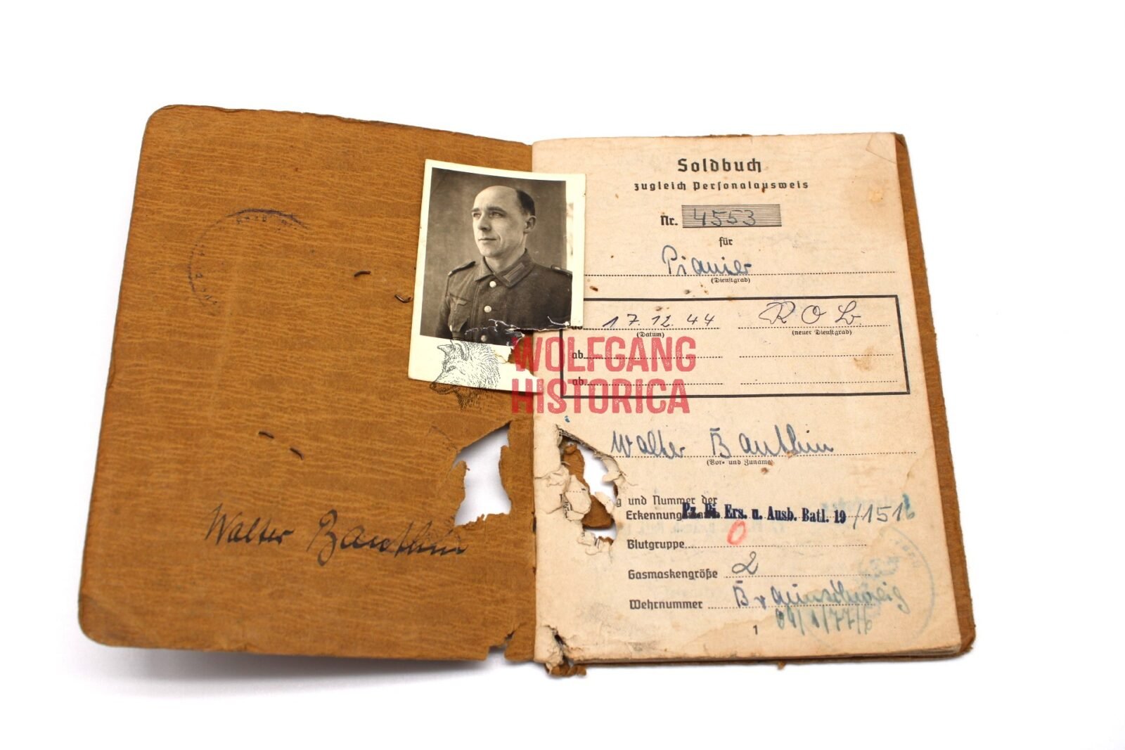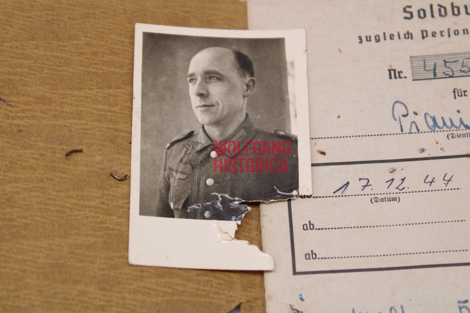 Complete without photo, but it came with an extra (damaged) photo. Likely this is also him. Possibly a duplicate photo that was kept in the soldbuch. Soldbuch looks to have shrapnel damage.