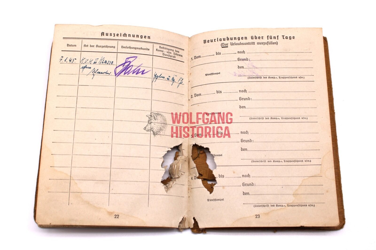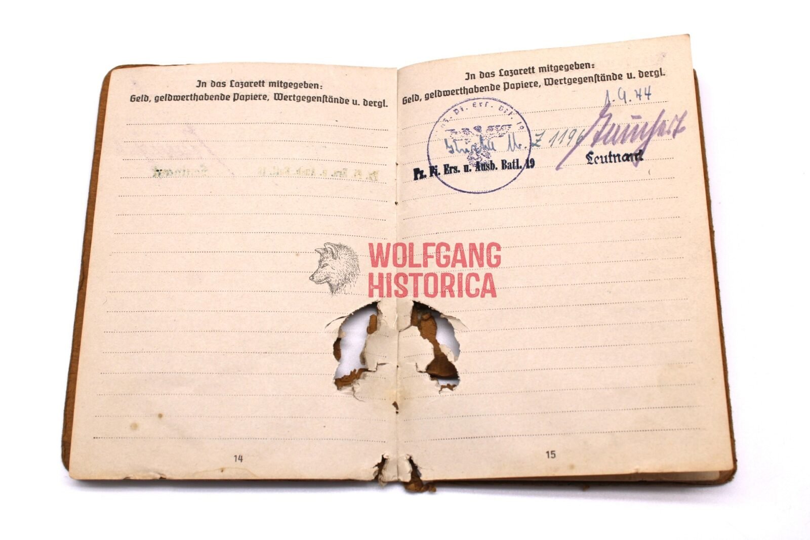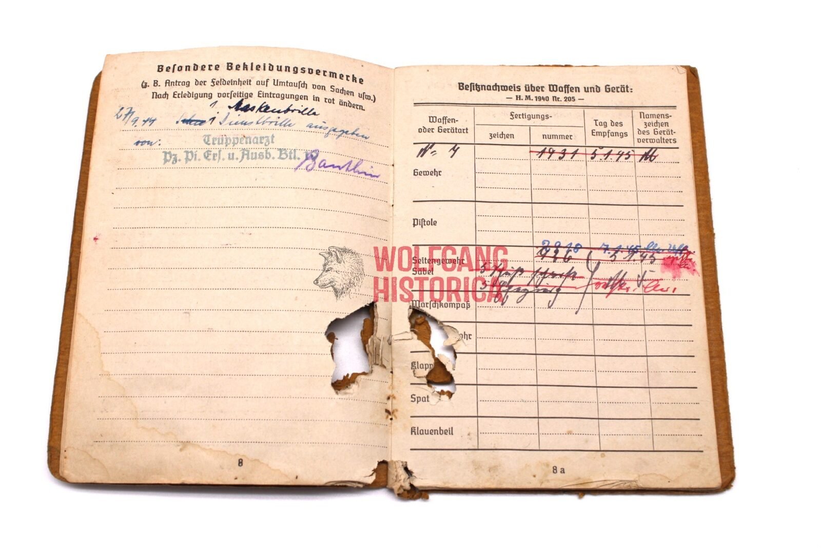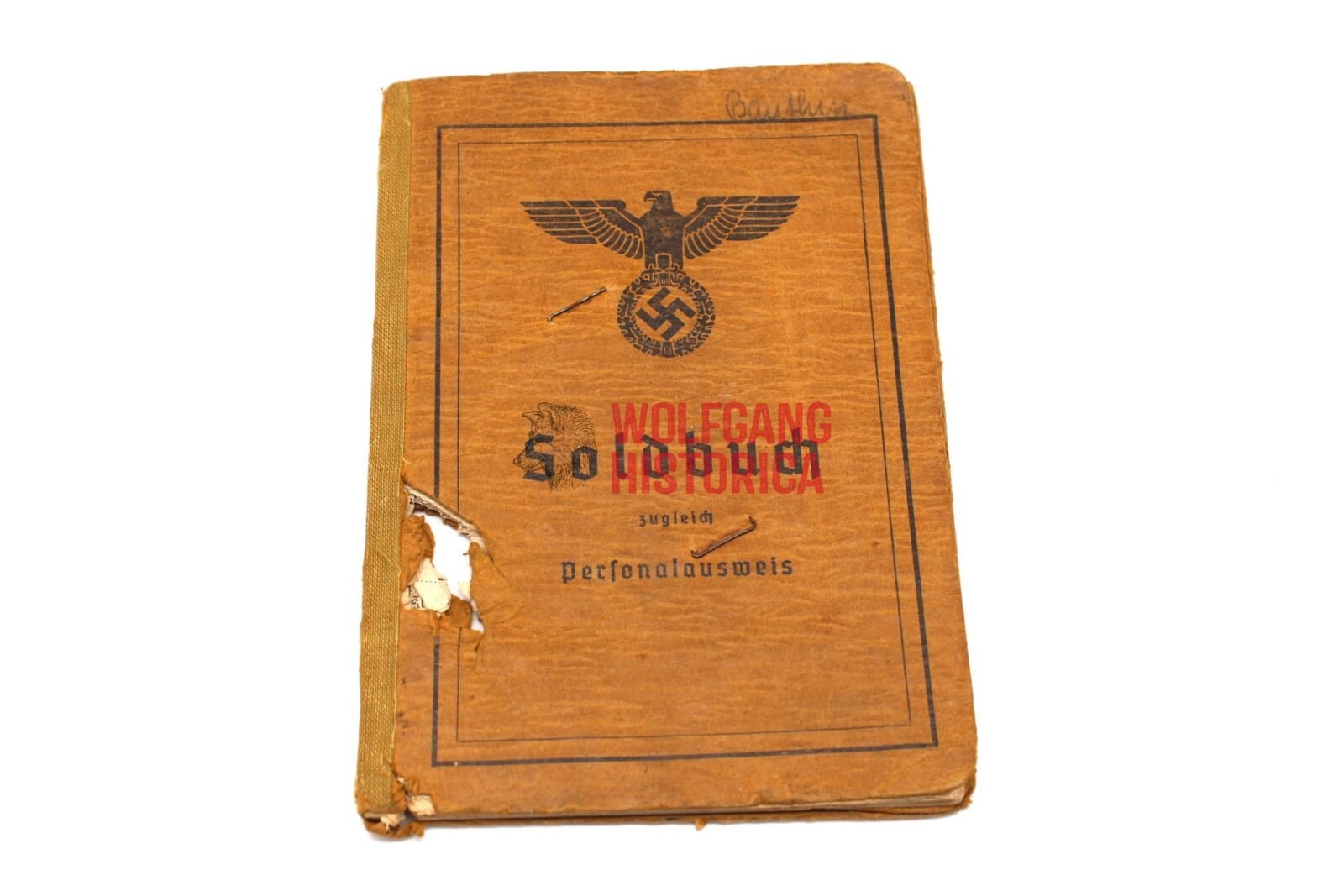 Complete without photo, but it came with an extra (damaged) photo. Likely this is also him. Possibly a duplicate photo that was kept in the soldbuch. Soldbuch looks to have shrapnel damage.