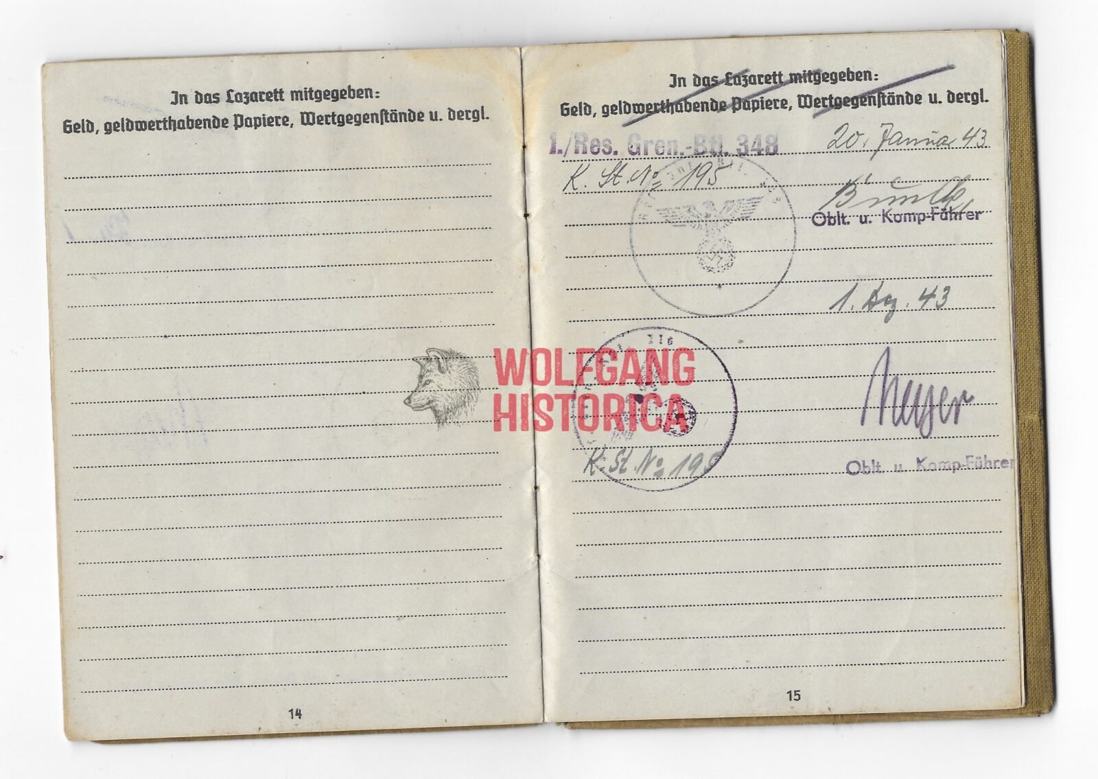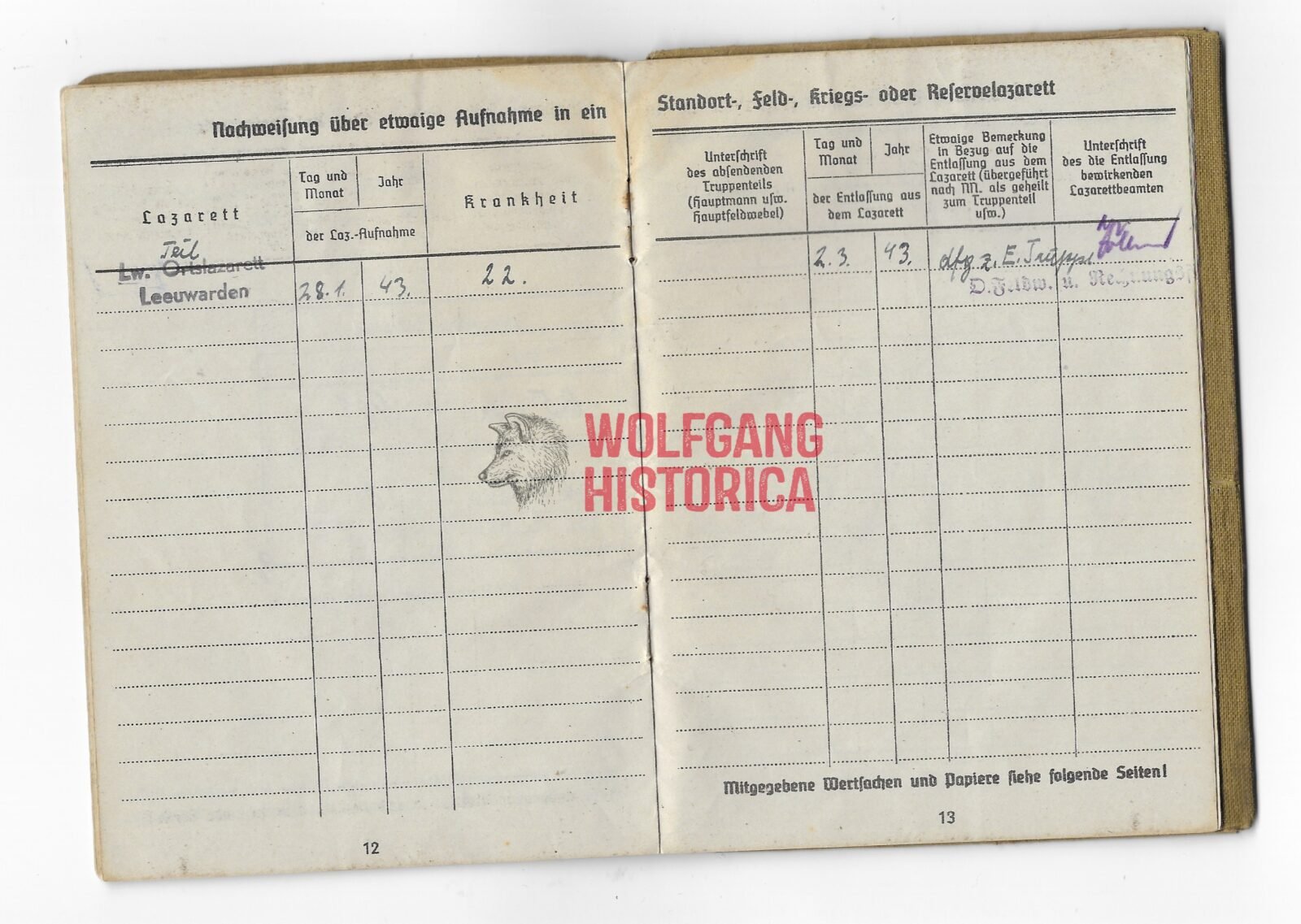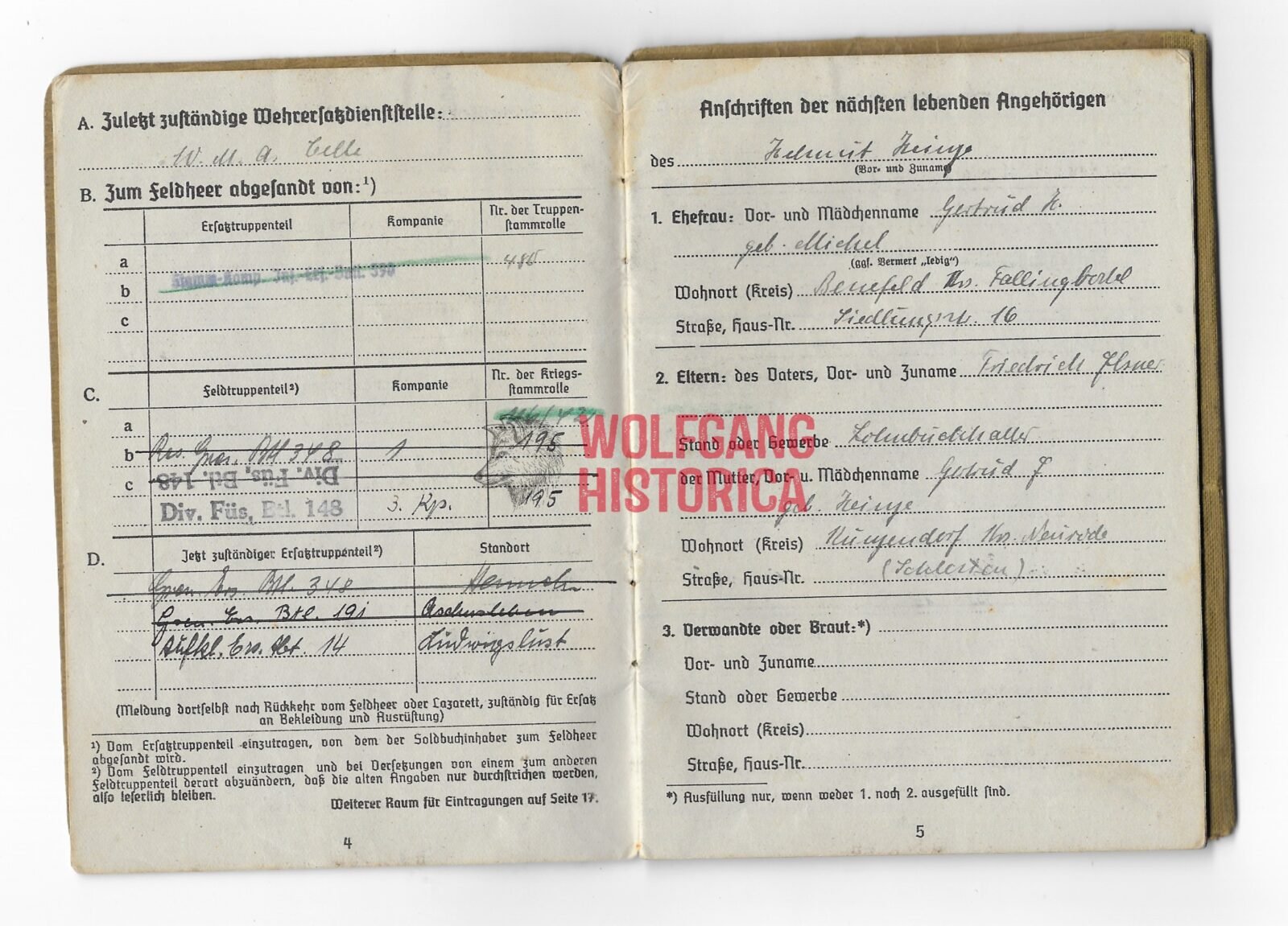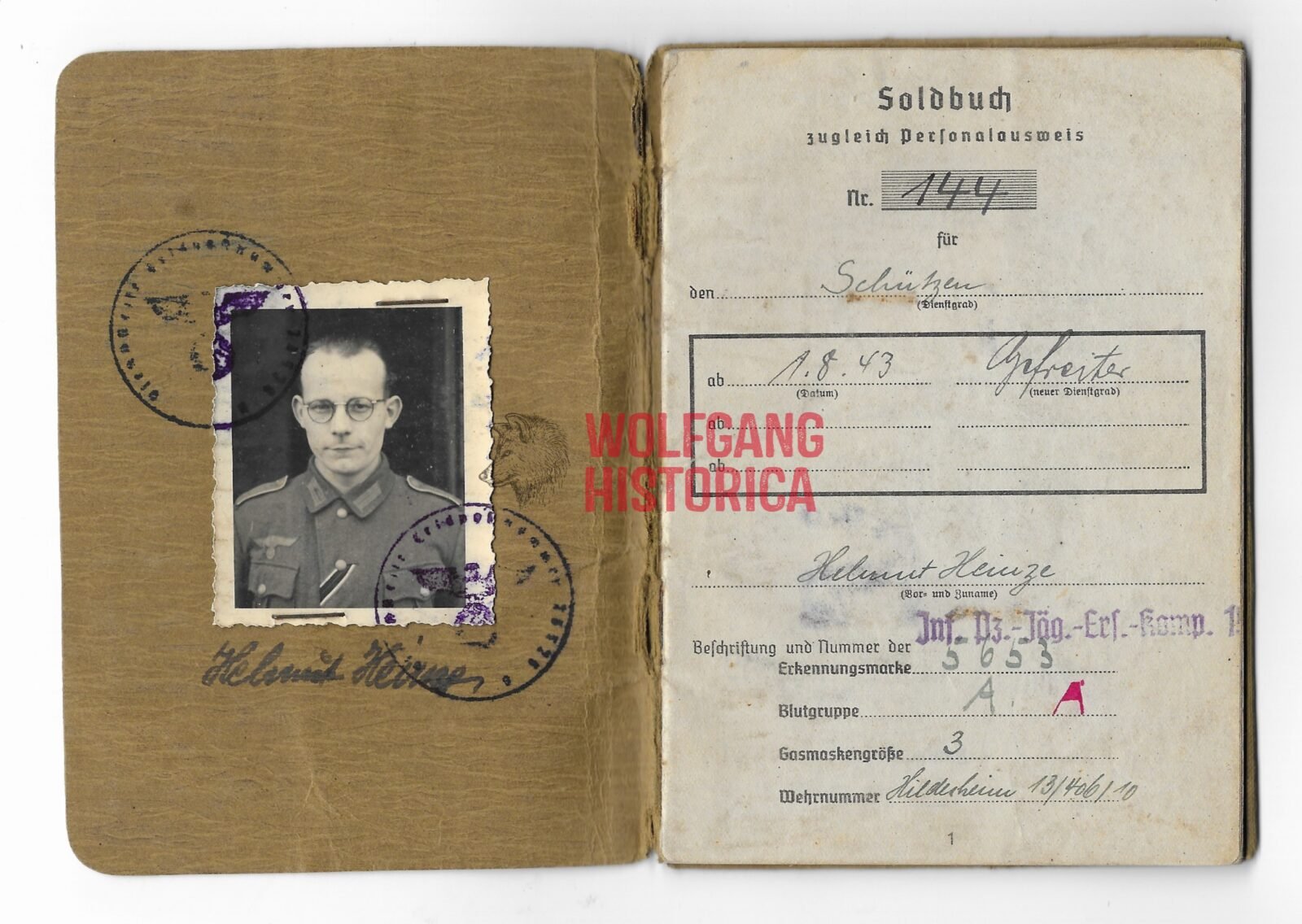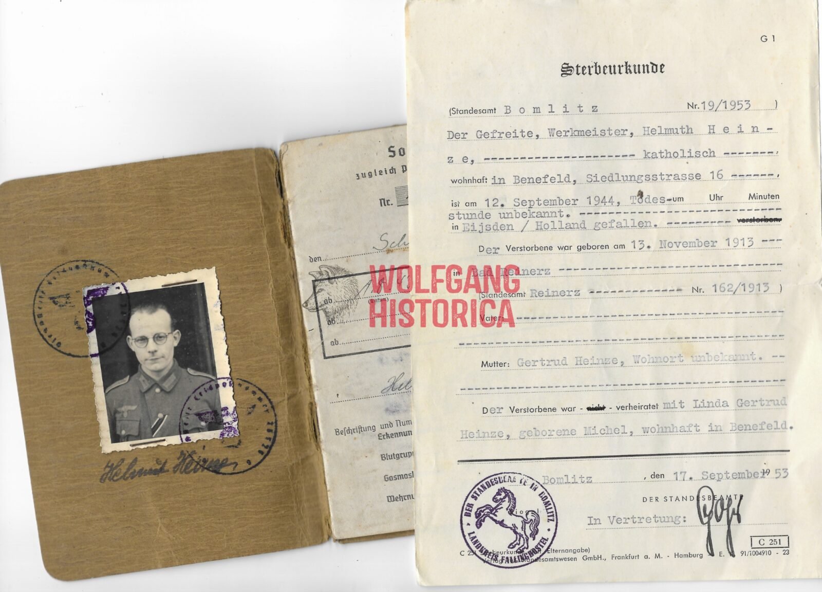 Original Death Certificate & Soldbuch of Gefreiter Helmuth Heinze. Born on November 13, 1943 in Bad Reinerz. Soldbuch opened on November 10, 1942 with the Infanterie-Panzerjäger-Ersatz-Kompanie 19. Promoted in 1943 with the Reserve-Grenadier-Bataillon 348 before ending up with the 3. Kompanie/ Divisions-FĂĽsilier-Bataillon 148. He was Killed in Action on September 12, 1944 in Eijsden near the farm of Duysens-Ernon in Maarland. He’s named in the book “De Bevrijding van Eijsden-Maarland in September 1944” (available as well on the internet). His named twice and also his fate – how and what – is fully described (in Dutch):