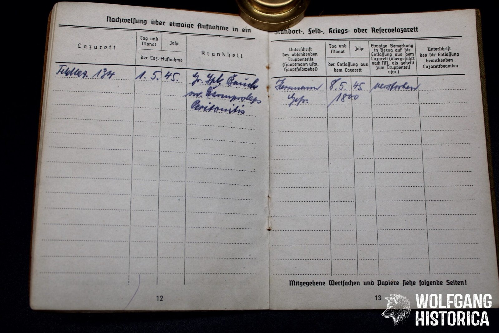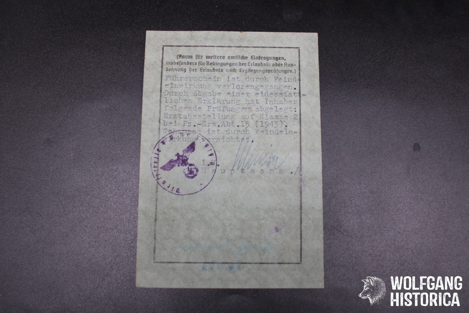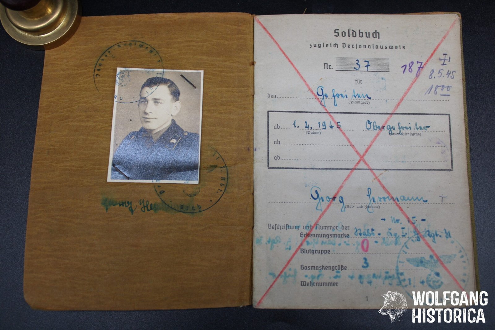 Original Soldbuch & Führschein (Zweitschrift, both likely were destroyed in combat before, typical with Panzermen) of Obergefreiter Georg Hermann, who served with the Stabskompanie der I. (Panther!) Abteilung/ Panzer-Regiment 31 and was decorated with the Panzerkampfabzeichen in Silber on November 28, 1944 while fighting on a Panther! He primarily served with this unit and may have ended up very late war with an – unknown – unit Panzergrenadier-Regiment G.O.H. (?). On May 1, 1945 he was taken in a Feldlazarett severely wounded with Granatsplitte bauch, Darmprobe, Peritonitis and succumbed to his wounds on May 8, 1945 at 1800 hours! Soldbuch complete with photo. Condition as seen.
