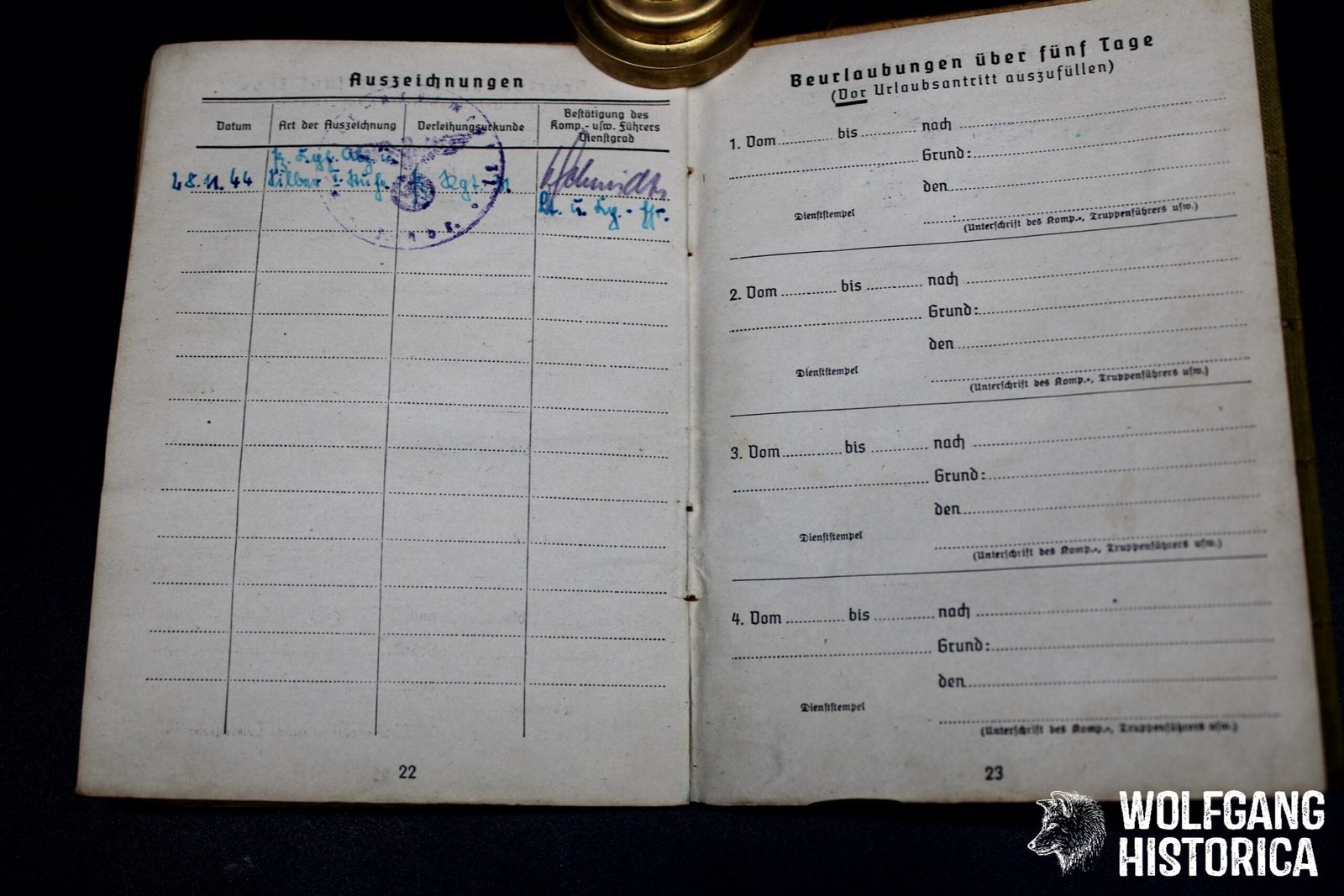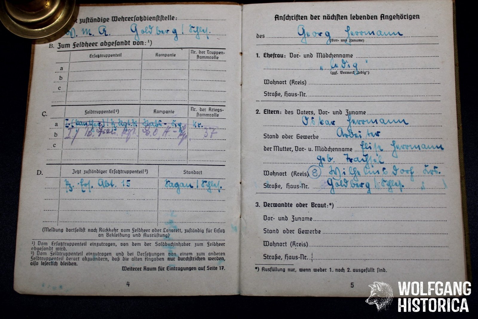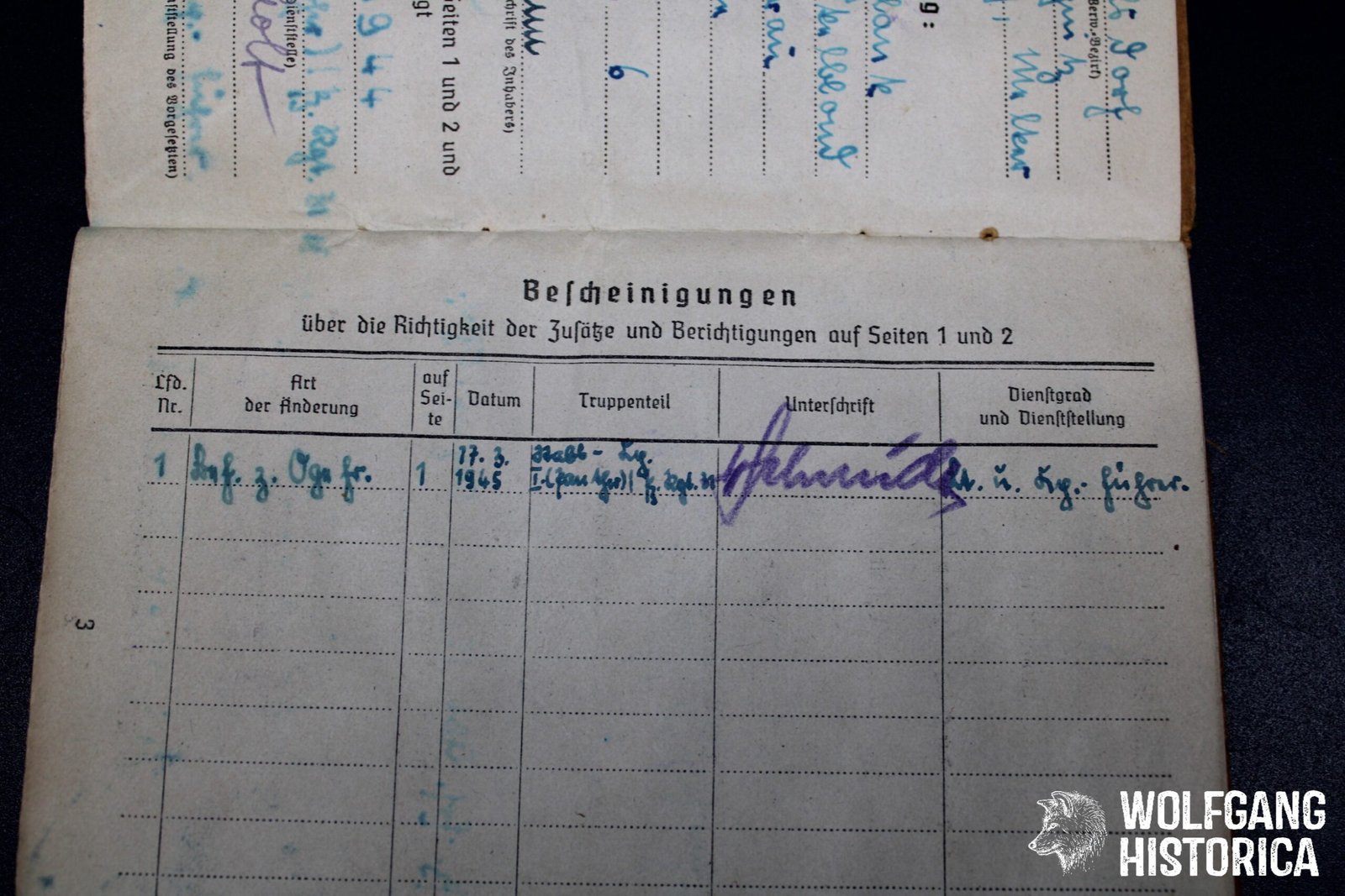 Original Soldbuch & Führschein (Zweitschrift, both likely were destroyed in combat before, typical with Panzermen) of Obergefreiter Georg Hermann, who served with the Stabskompanie der I. (Panther!) Abteilung/ Panzer-Regiment 31 and was decorated with the Panzerkampfabzeichen in Silber on November 28, 1944 while fighting on a Panther! He primarily served with this unit and may have ended up very late war with an – unknown – unit Panzergrenadier-Regiment G.O.H. (?). On May 1, 1945 he was taken in a Feldlazarett severely wounded with Granatsplitte bauch, Darmprobe, Peritonitis and succumbed to his wounds on May 8, 1945 at 1800 hours! Soldbuch complete with photo. Condition as seen.