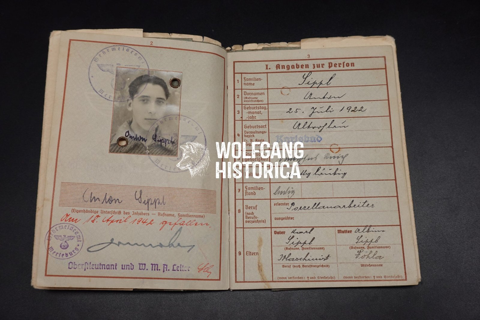 Original World War II Wehrpass issued to Gefreiter Anton Sippl, documenting armored service with Panzer-Regiment 3 of the 2. Panzer-Division.