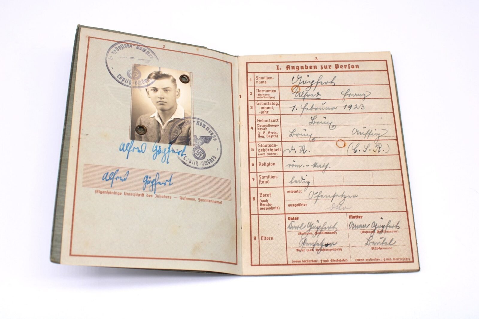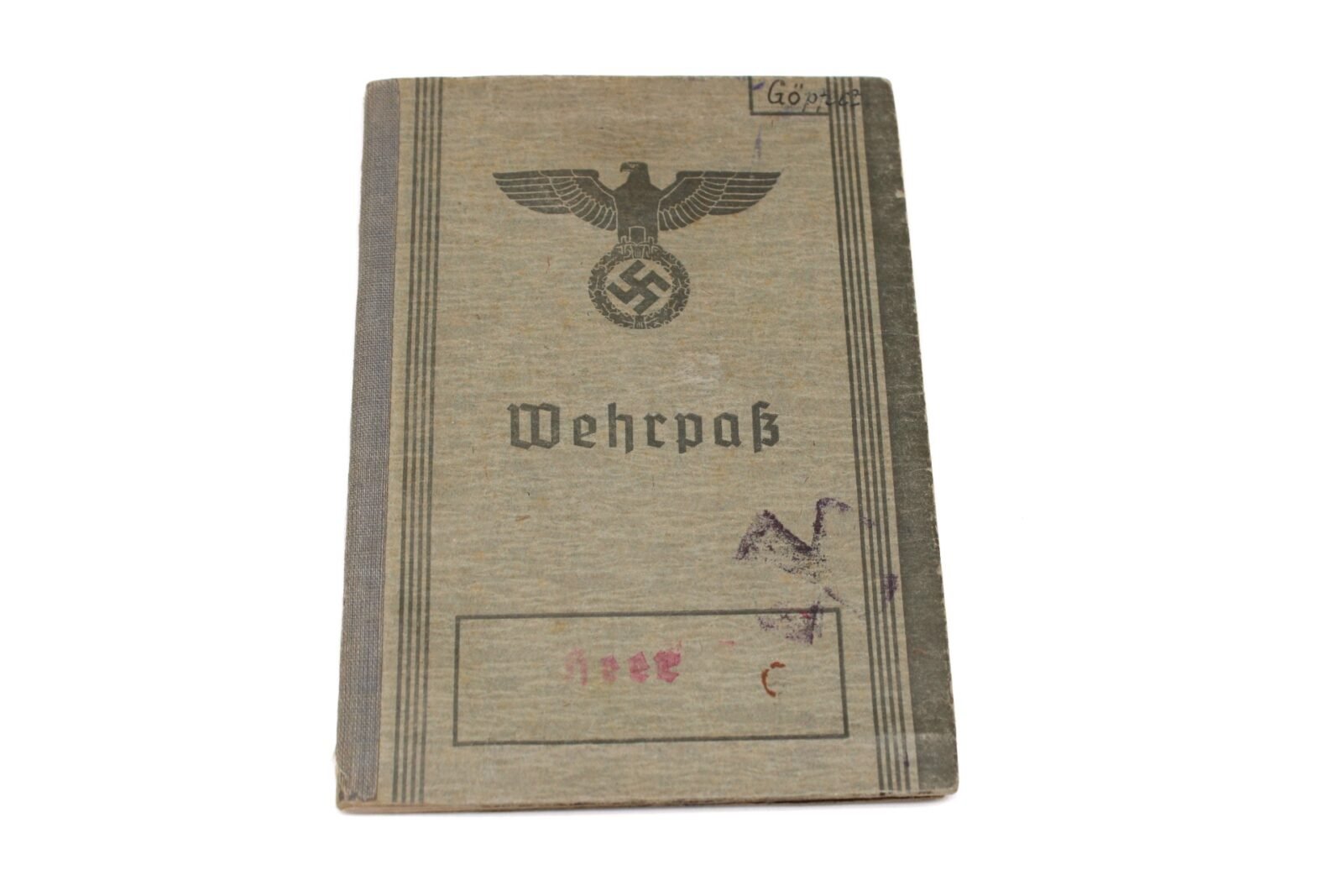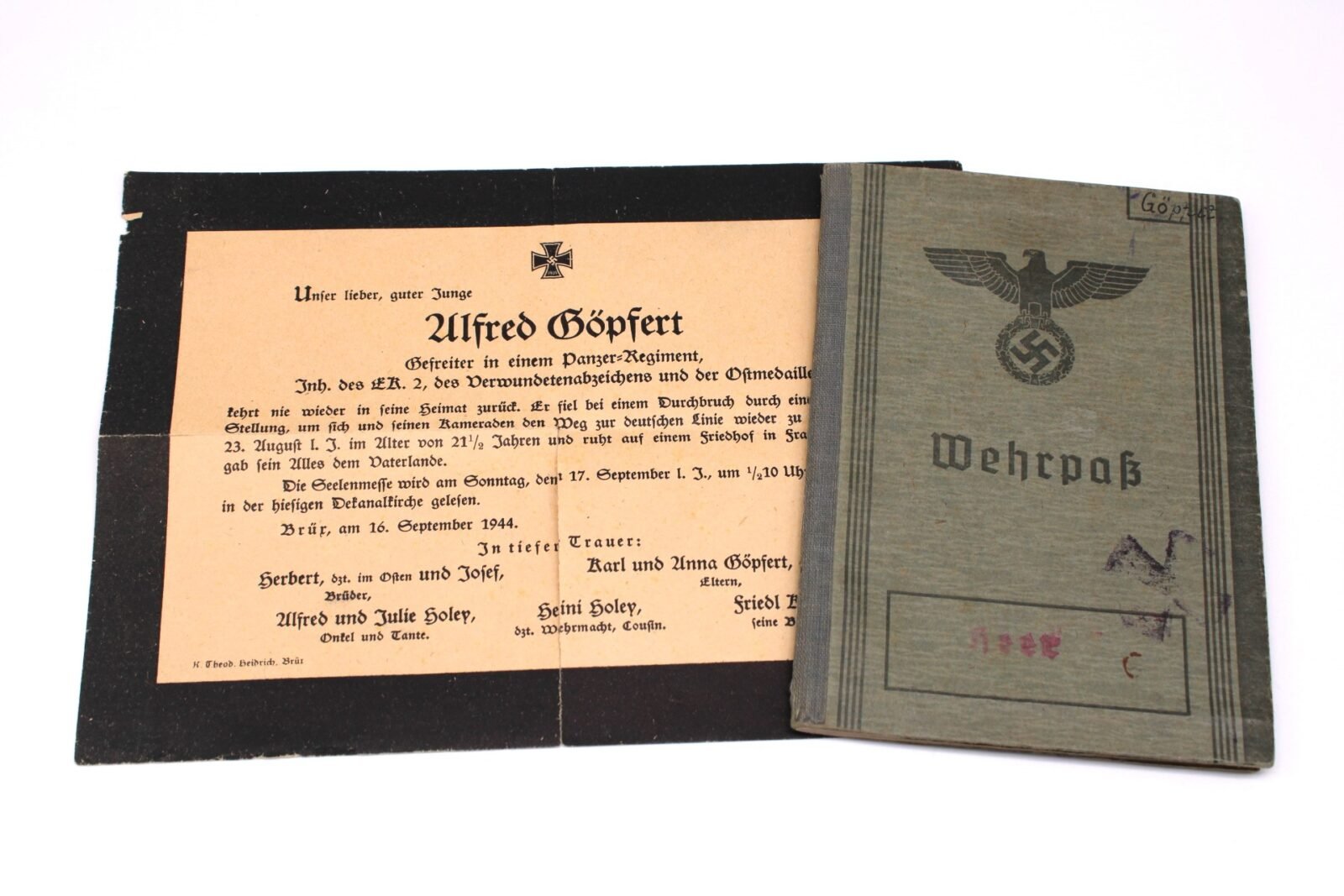 Original Wehrpass of Gefreiter Alfred Göpfert who served with the Schnelle-Abteilung 387, Panzerjäger-Abteilung 387 and Panzerjäger-Abteilung 708 of the 708. Infanterie-Division. During his service, he earned the Winterschlacht im Osten 1941/42 (10.11.42), Verwundetenabzeichen in Schwarz (8.11.43) and the Eisernes Kreuz 2. Klasse (posthumously on 13.10.1944!). Gefreiter Alfred Göpfert was Killed in Action at Epineu (?), France on August 23, 1944 due a “Brust und Bauchschuss“.