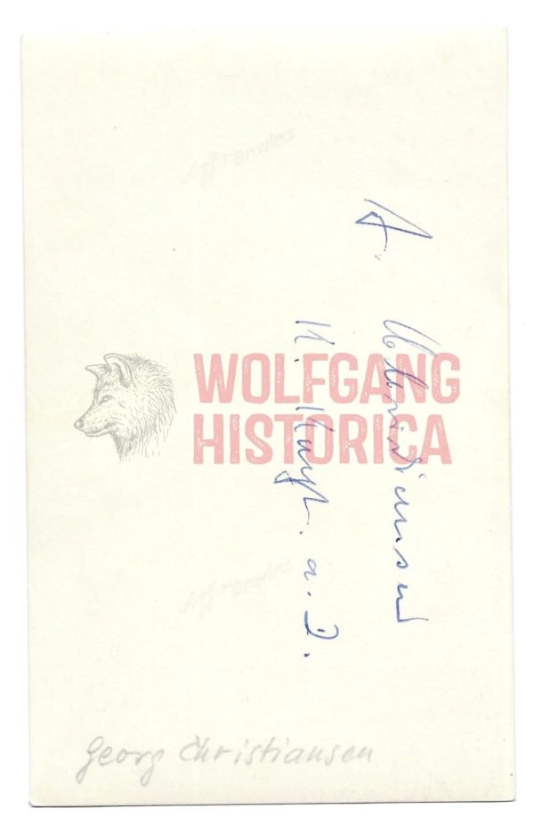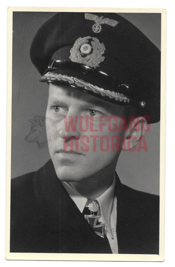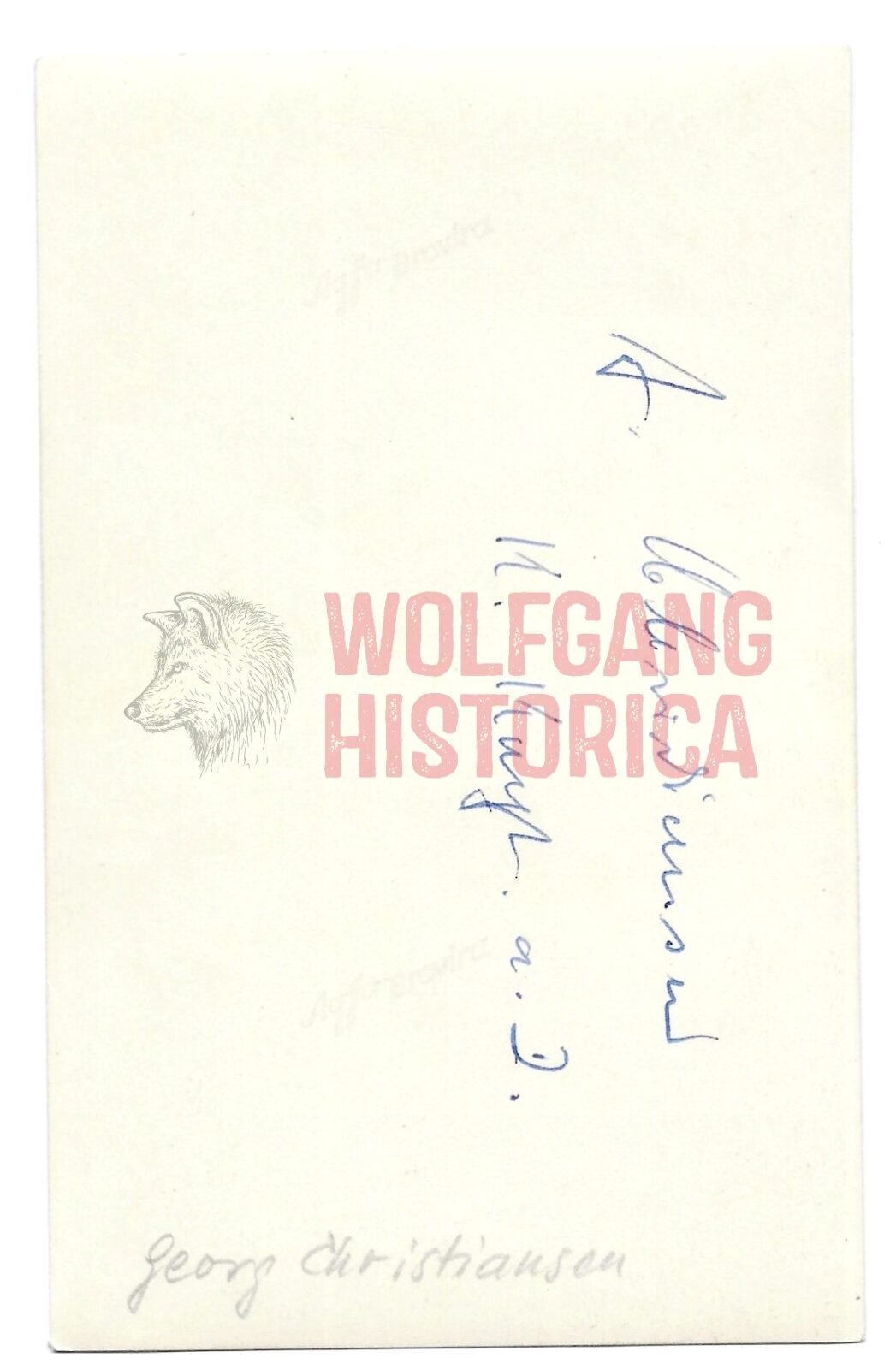 Studioportrait with postwar signature of Korvettenkapitän Georg Christiansen (21.10.1914 † 14.06.1997) who earned the Ritterkreuz des Eisernen Kreuzes on May 8, 1941 as Oberleutnant zur See u. Kommandant of the Schnellboot S-101 and the Eichenlaub on Novembre 13, 1943 as Korvettenkapitän und Chef of the 1. Schnellbootsflotille. Measuring: 9×14 cm.