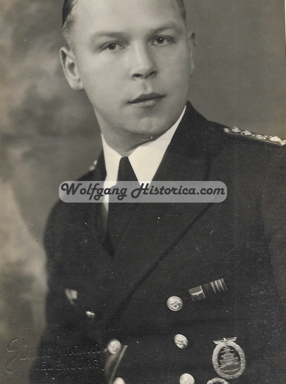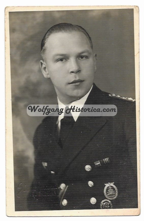 Stunning Wartime Studioportrait of a Kriegsmarine (Oberleutnant ?) wearing the Flottenkriegsabzeichen (High Seas Fleet War Badge), DRL-Sportabzeichen and ribbon bar containing the Memelland Medaille and he’s also wearing the ribbon on his uniform for the Medaille Kreuzzug gegen den Kommunismus! Very rare to be seen with Kriegsmarine personnel in wear! Writing on the backside. Portrait was taken in Neuenburg, studio mark on the bottom left corner. Postcardsize.
