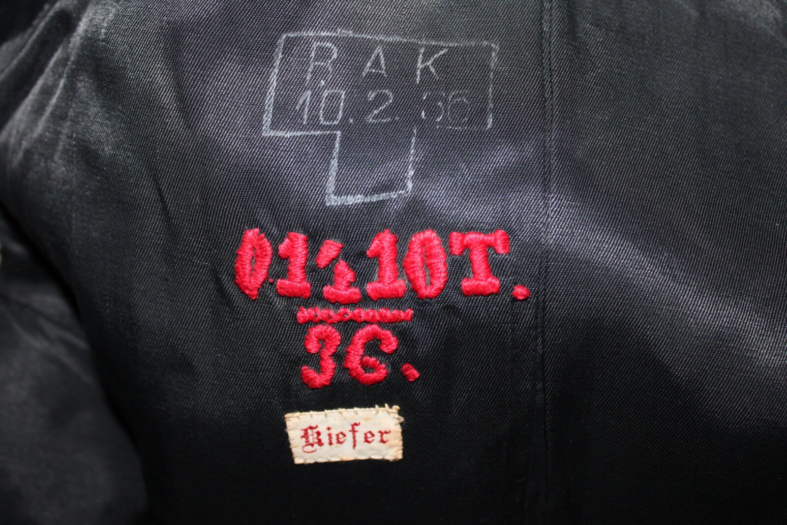 Original Stunning Kriegsmarine Paradejacke which belonged to Obermaschinenmaat Hermann Kiefer (O1410T/36). He was born on 17.01.1916 and met his fate when the Hilfskreuzer Michel was sunk on October 17, 1943 near Japan when it was torpedo’d by a US Submarine! During his service, Kiefer earned the Hilfskreuzer-Kriegsabzeichen, EK2 and EK1. I’ve attached (not included in the sale) a photo of the uniform while in wear by Kiefer on his wedding day (?) A flower was in the pocket (also seen on the photo) and can be added to the collar again.