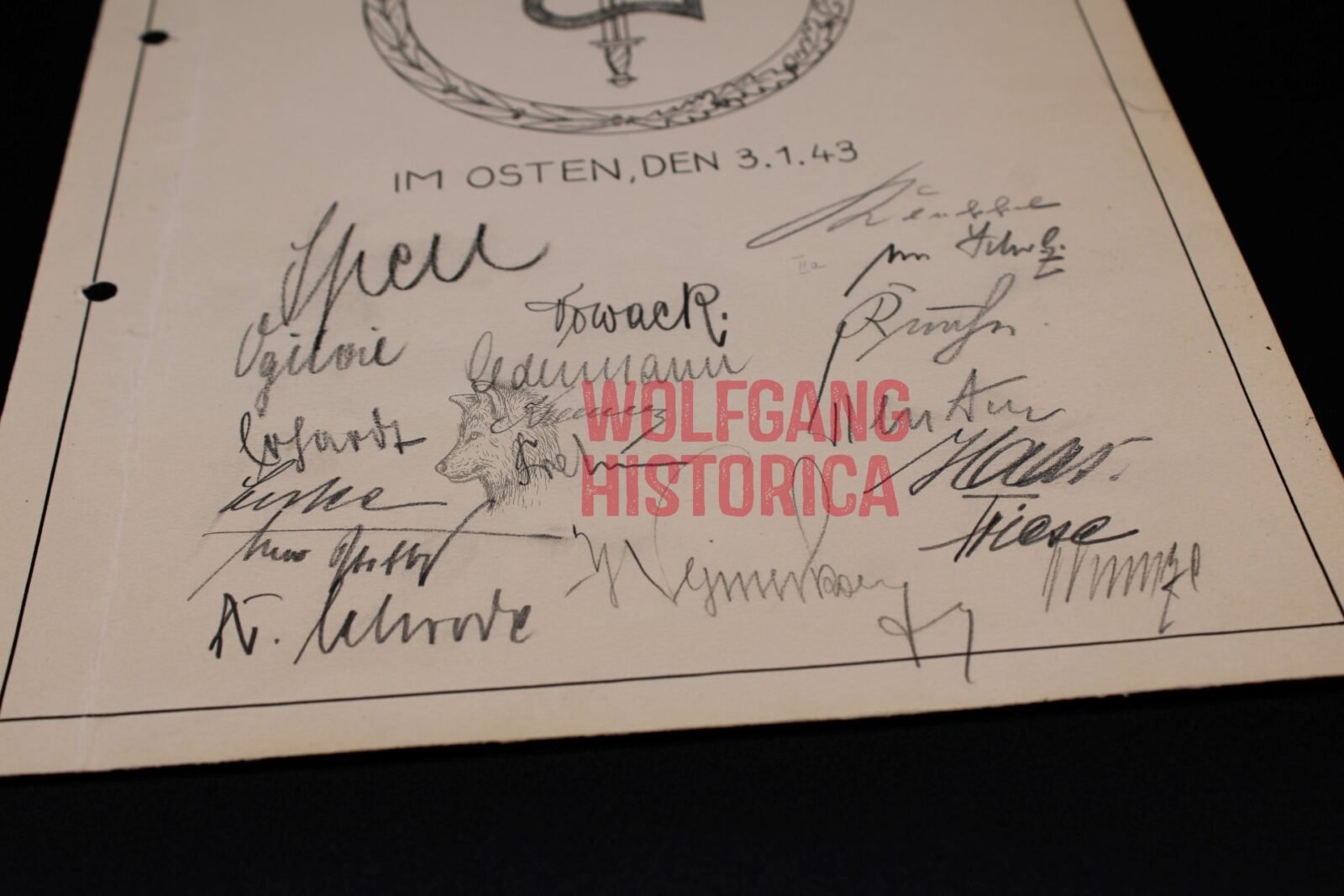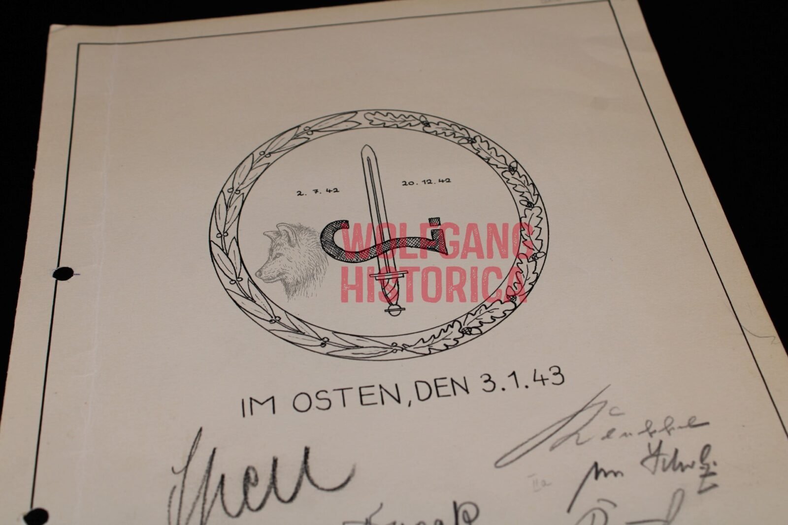 A4-sized L. Armeekorps (50.) document signed by the (whole) Army Staff such as General der Kavallerie Philipp Kleffel (Ritterkreuz), Major i.G. Horst Ogilvie, Oberst i.G. Rudolf Sperl etc. Good condition. Punched.
