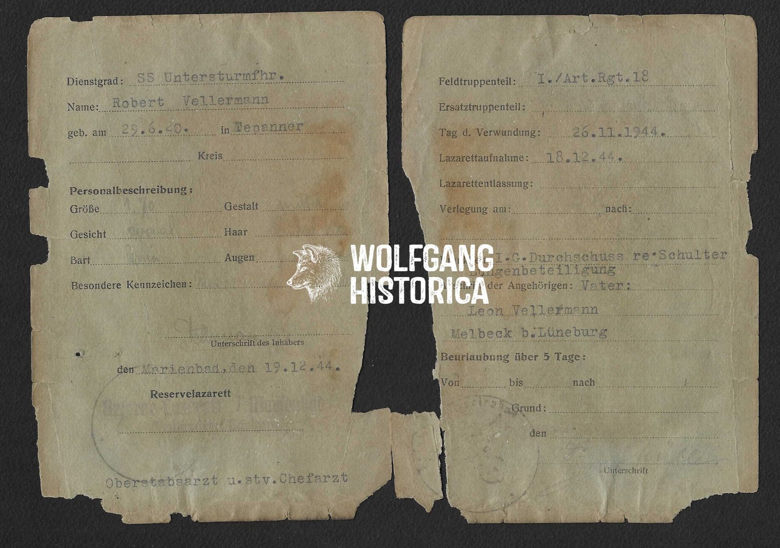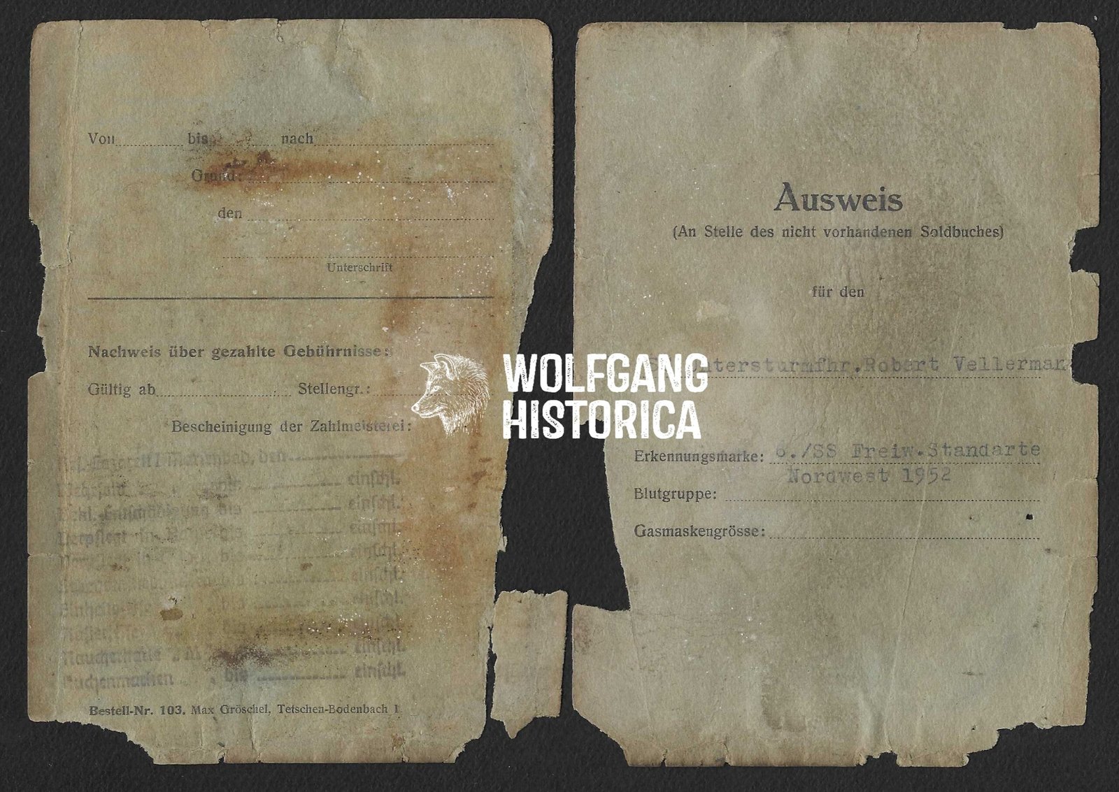 Original ultra rare Lazarett Ausweis for a Flemish Waffen-SS Officer – SS-Untersturmführer Velleman, who served with the Nordwest, Legion Flandern, “Horst Wessel” an at the end with SS-Artillerie-Regiment 27 of the 27. SS-Freiwilligen-Grenadier-Division “Langemarck”. This was put in the ground and later digging up by himself! Bad condition but very scarce.