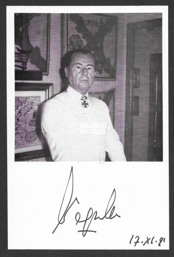 Leon Degrelle remains one of the most controversial and well-known foreign volunteers of the Waffen-SS. His rise from volunteer soldier to divisional commander, along with his postwar exile and continued notoriety, makes his autograph especially rare and sought-after. This large-format signed photo is an exceptional piece for advanced collectors of Waffen-SS history, foreign volunteer units, and Knight’s Cross recipients.
