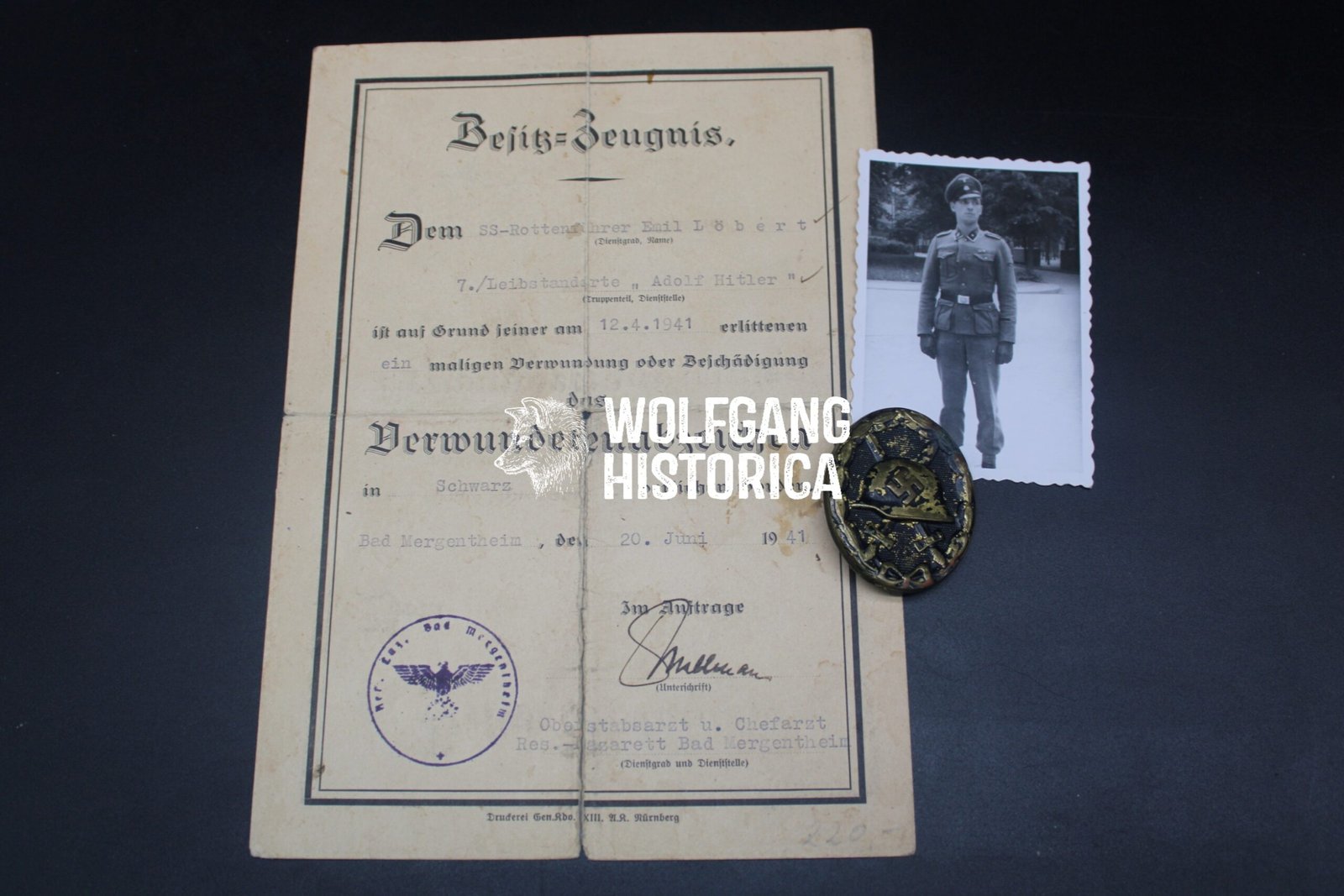 Original Verwundetenabzeichen in Schwarz (Wound Badge in Black) award document, issued to Emil Löbert, who was wounded in action on April 12, 1941, while serving with the 7. Kompanie / Leibstandarte-SS Adolf Hitler.
