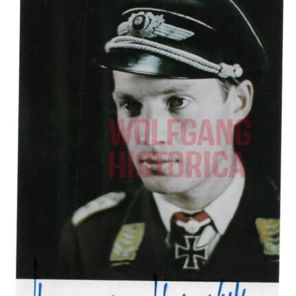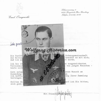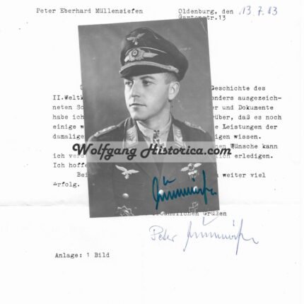 Original Postwar Signature on a Postwar Photo of Erich Rudorffer. Major Erich Rudorffer (01.11.1917 † 08.04.2016) earned the Deutsches Kreuz in Gold on December 9, 1941 as Leutnant und Flugzeugführer in the 6. Staffel/ Jagdgeschwader 2 “Richthofen”, the Ritterkreuz on May 1, 1941 as Leutnant und Flugzeugführer in the 6. Staffel/ Jagdgeschwader 2 “Richthofen”, the Eichenlaub on April 11, 1944 as Major und Kommandeur of the II. Gruppe/ Jagdgeschwader 54 “Grünherz” and the Schwertern on January 26, 1945 as Major und Kommandeur of the II. Gruppe/ Jagdgeschwader 54 “Grünherz”. Plus letter!