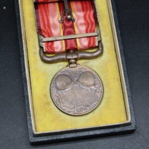 Instituted in 1934, the medal was issued to members of the Army, Navy, and supporting organizations who took part in combat operations, logistical support, or administrative duties related to the campaign. Its obverse features the Imperial chrysanthemum crest above a spread-winged eagle, symbolizing military strength and the authority of the Emperor. The reverse displays two crossed military helmets and inscriptions denoting the Showa era years Six to Nine. The ribbon—shades of red with yellow and white stripes—represents loyalty and valor.