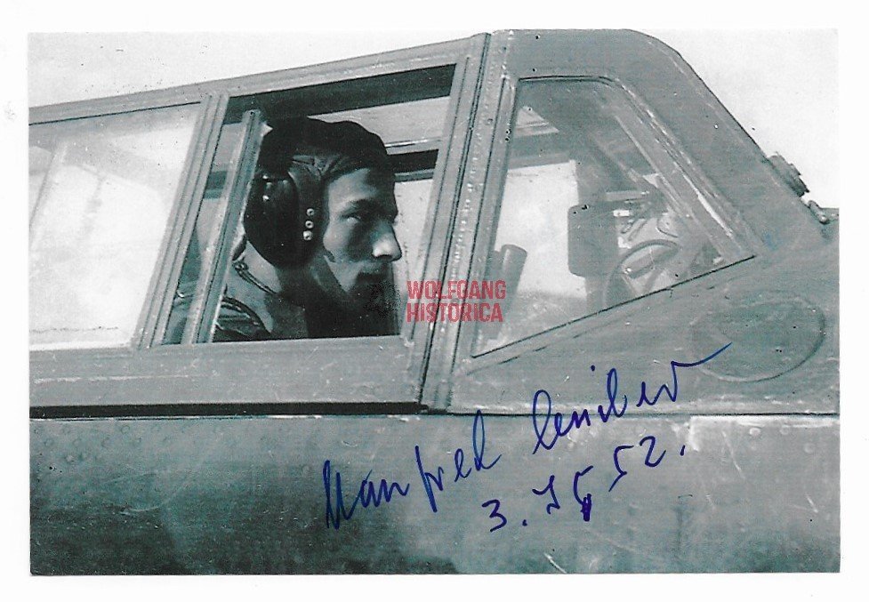 Original Postwar Signature on a Postwar Photo of Manfred Leisebein. Manfred Leisebein scored 5 aerial victories with the 3. Staffel/ Jagdgeschwader 52. Good condition. Postcardsize.