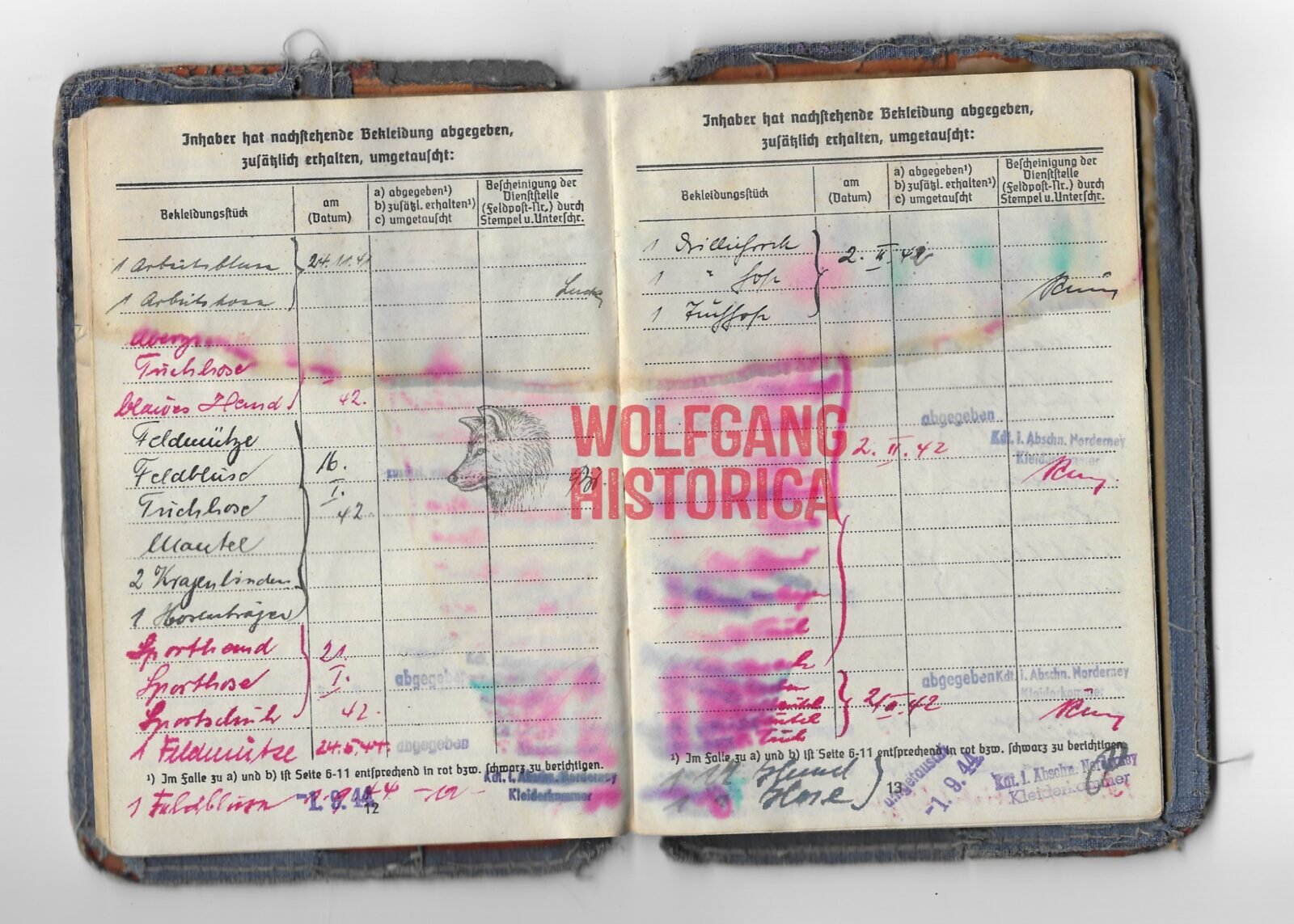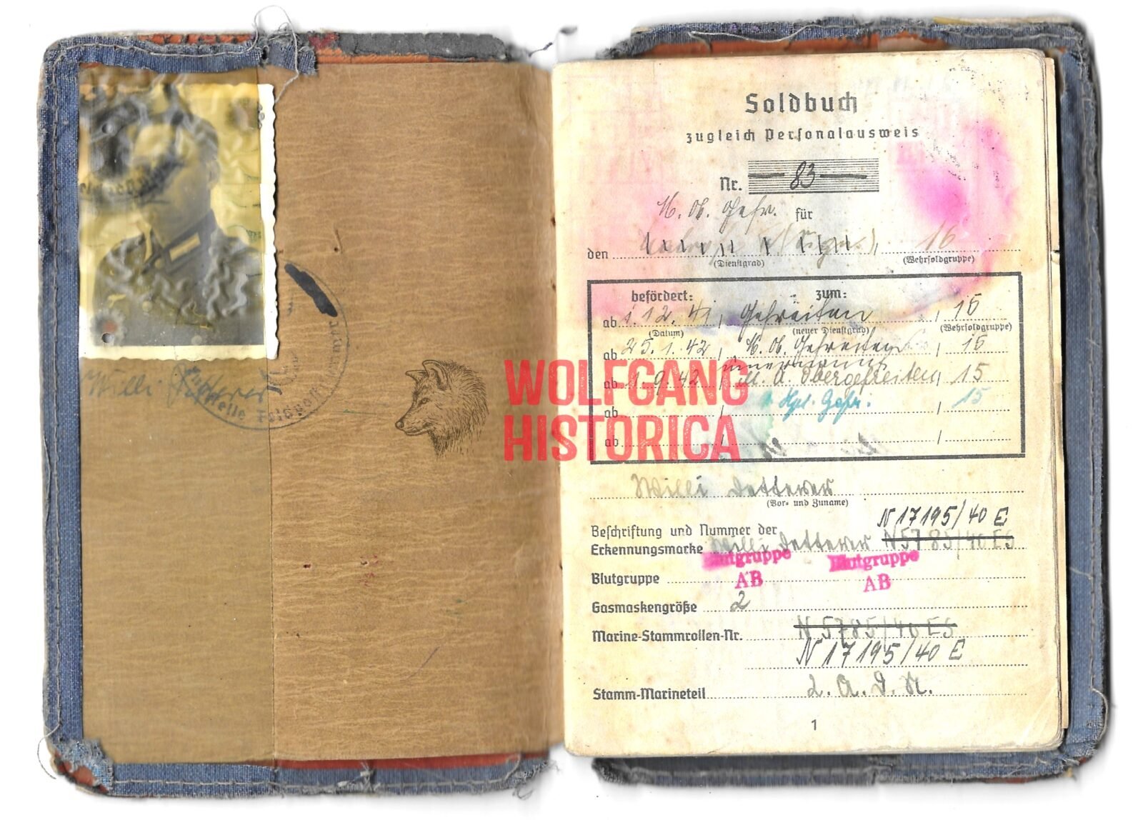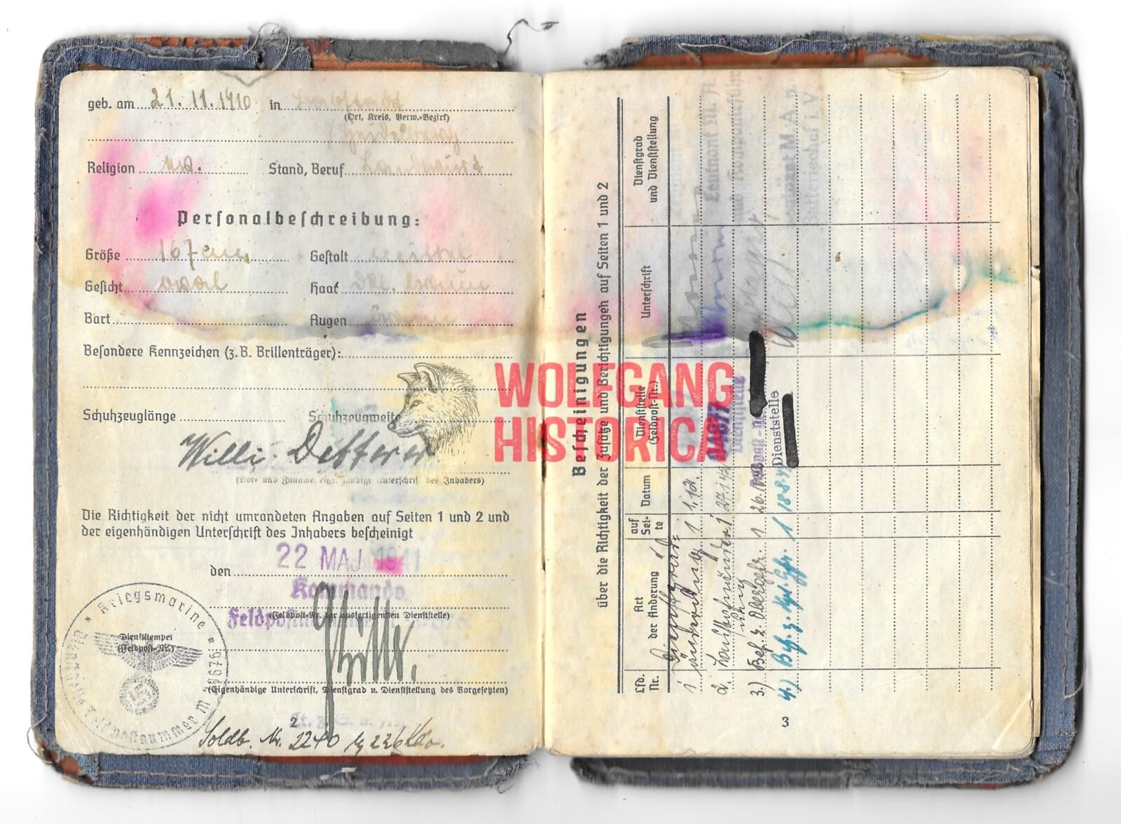 Original Soldbuch of (Marine Artillerie) Hauptgefreiter Willi Dettmer / Detterer (?) who served with the Marine-Flak-Abteilung 244 on Norderney! He earned the Kriegsverdienstkreuz 2. Klasse mit Schwertern (War Merit Cross 2nd Class with Swords) for his service on April 20, 1944. It seems that he, most likely in 1945, was transferred to Artillerie-Regiment 1719 of the 719. Infanterie-Division. Suffered water damage, condition as seen. Comes with several photographs.