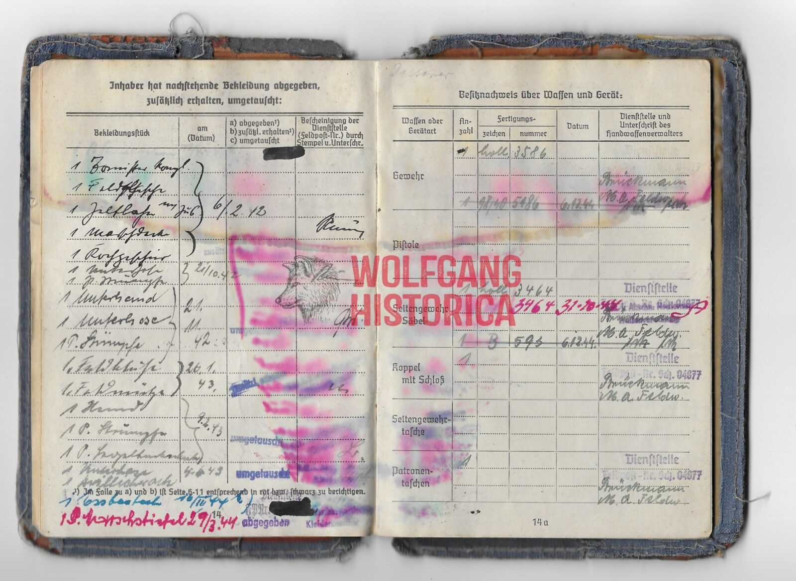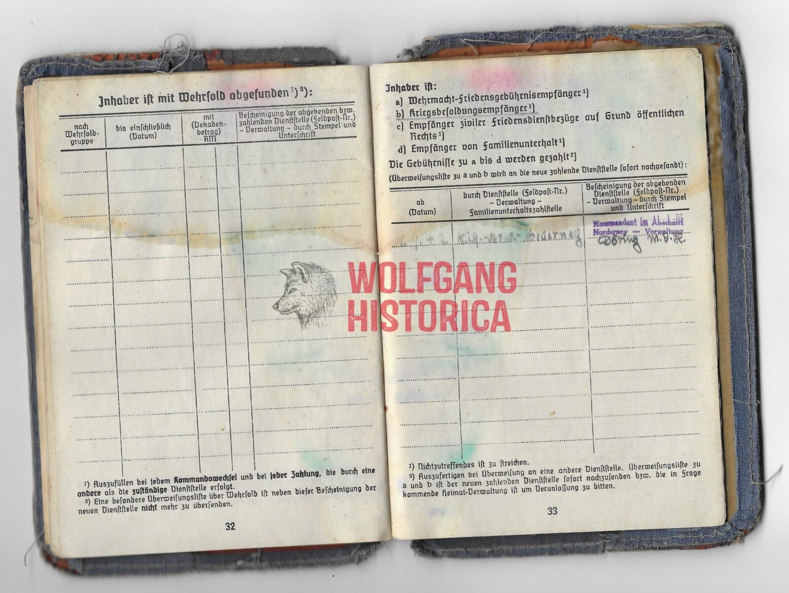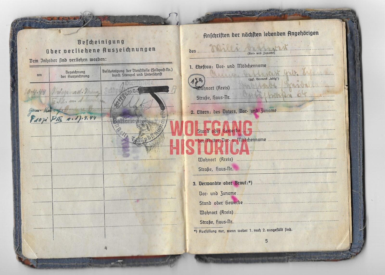 Original Soldbuch of (Marine Artillerie) Hauptgefreiter Willi Dettmer / Detterer (?) who served with the Marine-Flak-Abteilung 244 on Norderney! He earned the Kriegsverdienstkreuz 2. Klasse mit Schwertern (War Merit Cross 2nd Class with Swords) for his service on April 20, 1944. It seems that he, most likely in 1945, was transferred to Artillerie-Regiment 1719 of the 719. Infanterie-Division. Suffered water damage, condition as seen. Comes with several photographs.