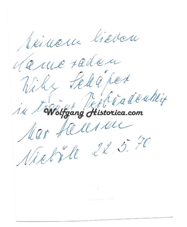 Original Postwar Signature on a Postwar Photo of Max Hansen. SS-Standartenführer Max Hansen (31.07.1908 † 07.03.1990) earned the Ritterkreuz on March 18, 1943 as SS-Sturmbannführer und Kommandeur of the II. Bataillon/ SS-Panzergrenadier-Regiment 1, the Eichenlaub on April 17, 1945 as SS-Standartenführer und Kommandeur of the SS-Panzergrenadier-Regiment 1 of the 1. SS-Panzer-Division “LSSAH“ and the Nahkampfspange in Gold on March 12, 1945. Good condition. Measuring: Postcardsize. Dedicated to former comrade.