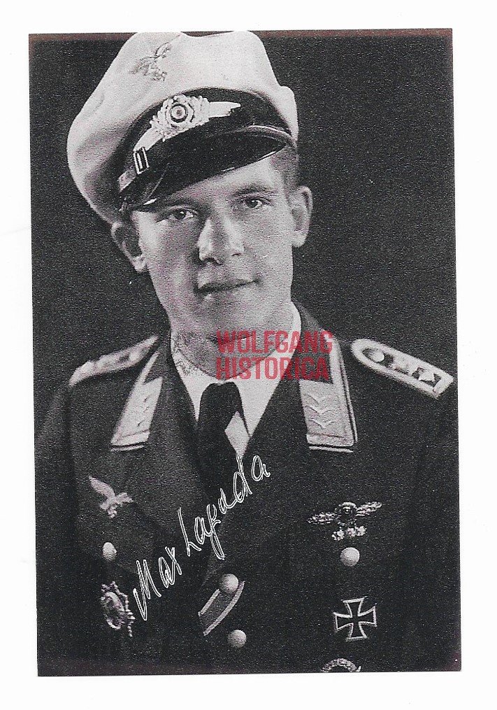Original Postwar Signature on a Postwar Paper Photo of Max Lagoda. Feldwebel Max Lagoda (23.01.1920 † 01.04.2016) earned the Deutsches Kreuz in Gold on October 17, 1943 as Feldwebel in the 2. Staffel/ Aufklärungsgruppe 100. Good condition. Postcardsize.