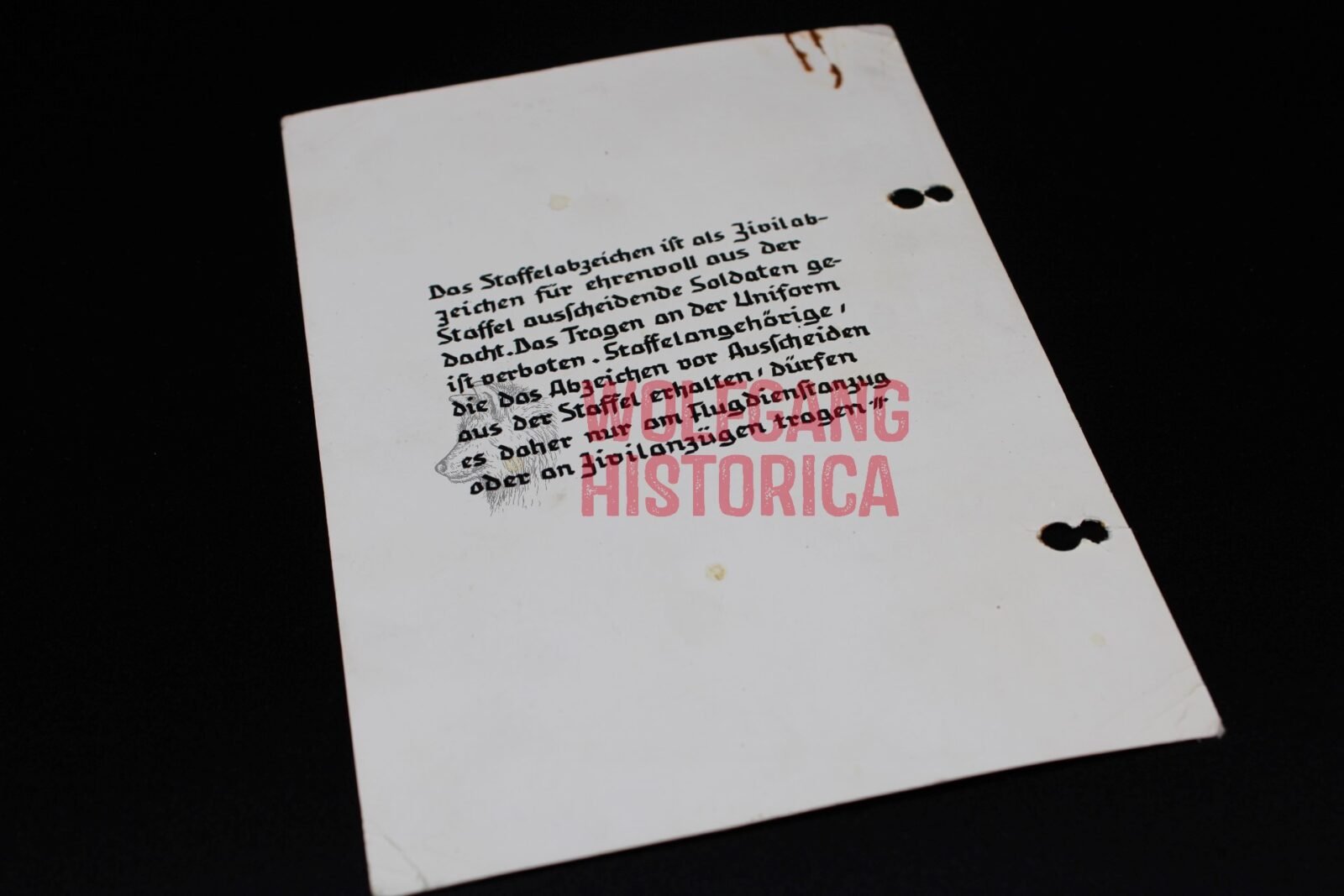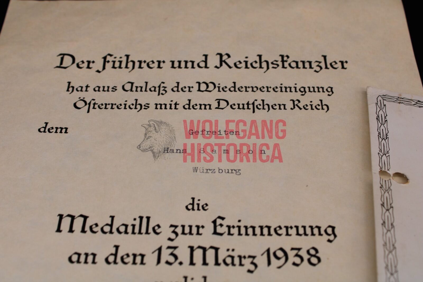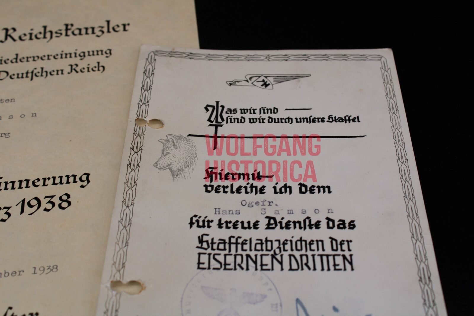 Award document for the Medaille zur Erinnerung an den 13. März 1938 (Austrian Occupation Medal) for (later) Obergefreiter Hans Samson. A4-size and was punched. Comes with a scarce unit award document for the “Staffelabzeichen der Eisernen Dritten” for the III. Staffel/ Aufklärungsgruppe 123! Punched.