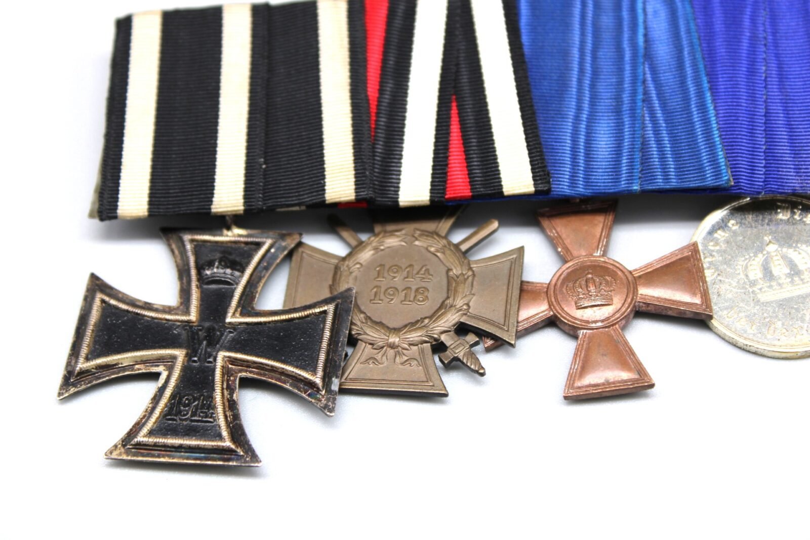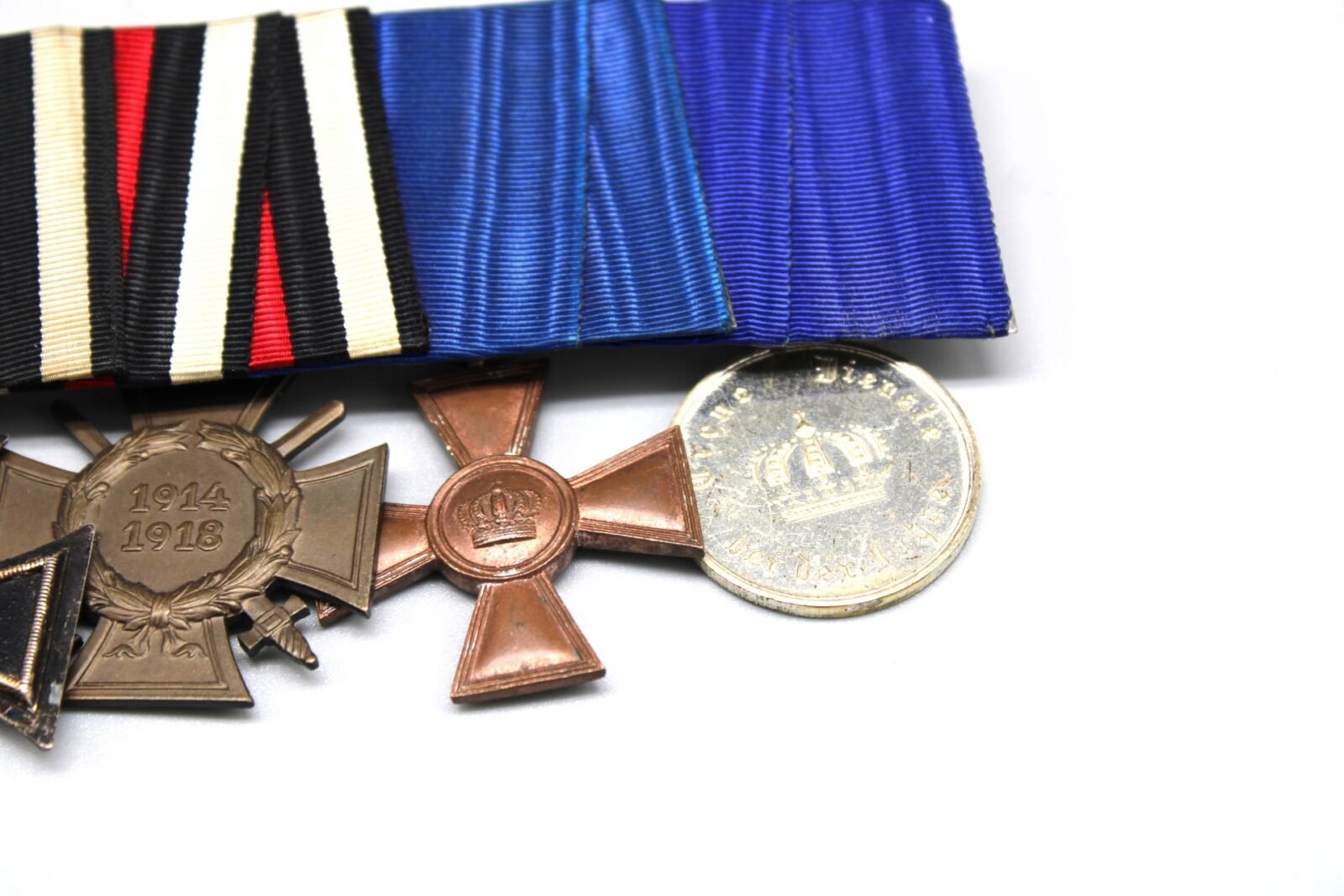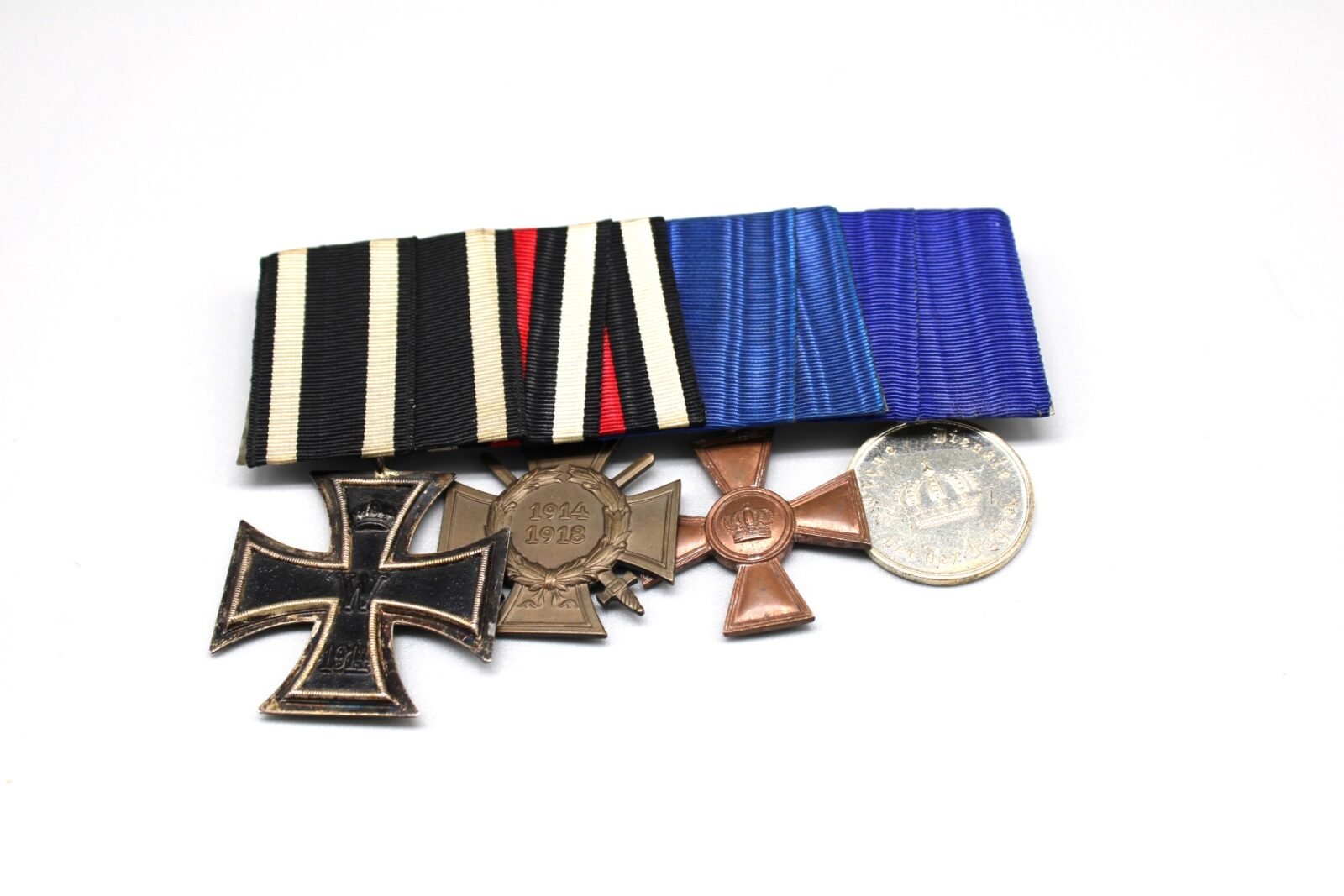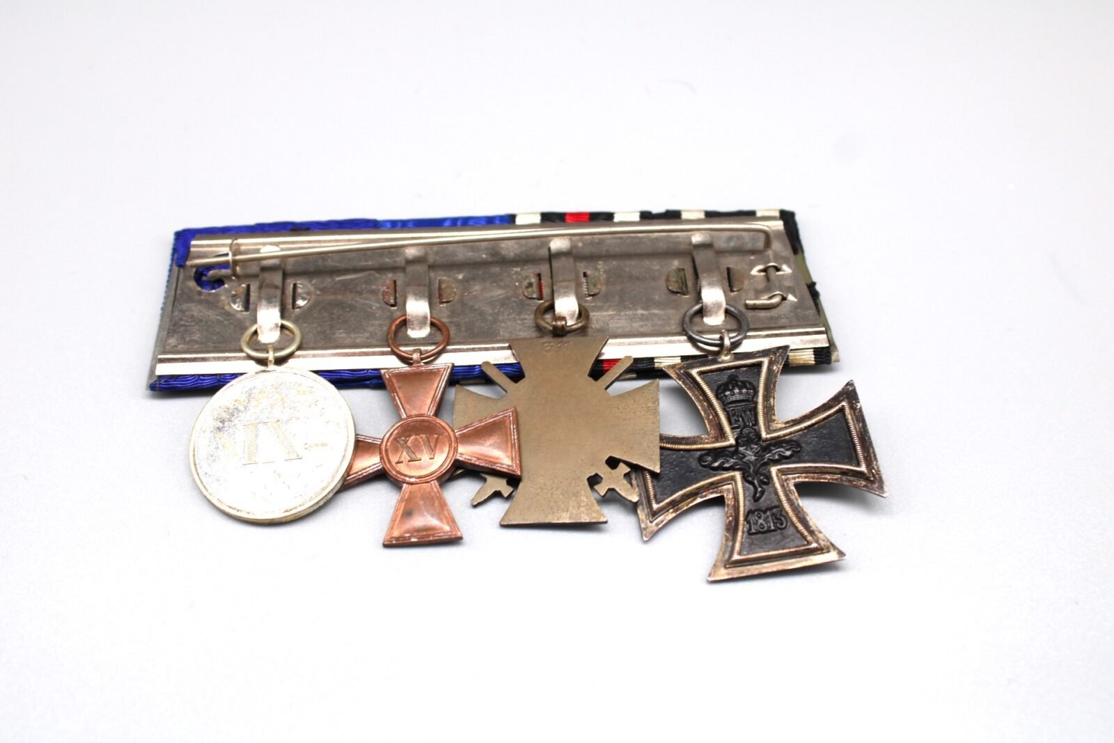Medal Bar: Eisernes Kreuz 2. Klasse (1914) (1914 Iron Cross 2nd Class), 1914-1918 Ehrenkreuz (1914-1918 Honor Cross), preußische Dienstauszeichnung 1. Klasse 1913 für 15 Jahre (Long Service Award 1st Class (1913 issue)) and preußische Dienstauszeichnung 3. Klasse 1913 für 9 Jahre (Long Service Award 3rd Class (1913 issue)). Good condition.