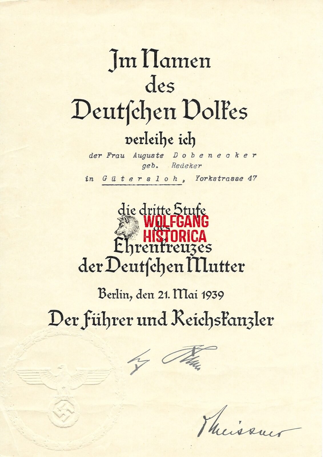 Award document for the Mutterkreuz in Bronze (Mother’s Cross in Bronze) or in full the Dritte Stufe des Ehrenkreuzes der Deutschen Mutter (Third Class of the Cross of Honour of the German Mother). The Mother’s Cross was instituted to award mother’s for their exhibited probity, exemplary motherhood and who raised at least 4 children. The Cross came in 3 grades: Bronze (4 or 5 Children), Silver (6-7) and Gold (8 or more) and was awarded from 1939 until 1945. Document is A4 size, bears the facismile signature of Adolf Hitler and Otto Meissner.