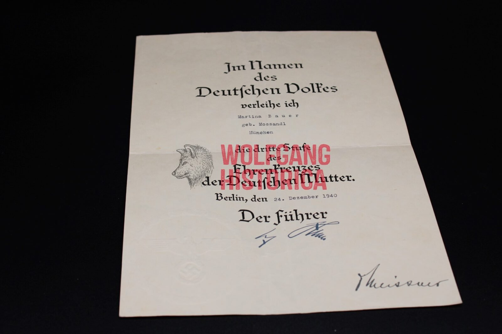 Award document for the dritte Stufe des Ehrenkreuzes der Deutschen Mutter (Cross of Honour of the German Mother also simply said ‘Mother’s Cross’). The Mother’s Cross was instituted to award mother’s for their exhibited probity, exemplary motherhood and who raised at least 4 children. The Cross came in 3 grades: Bronze (4 or 5 Children), Silver (6-7) and Gold (8 or more) and was awarded from 1939 until 1945. Document is A4 size, bears the facismile signature of Otto Meissner and has been folded several times.