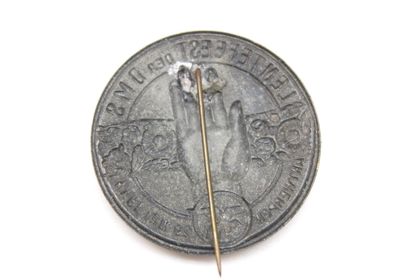 Original Flemish collaboration NSJV (“Nationaalsocialistische Jeugd in Vlaanderen”) – DMS (“Dietse Meisjesscharen”) pin.”Lentsefeest der DMS, Antwerpen 29 Mei 1944″. “Golden” colored version.