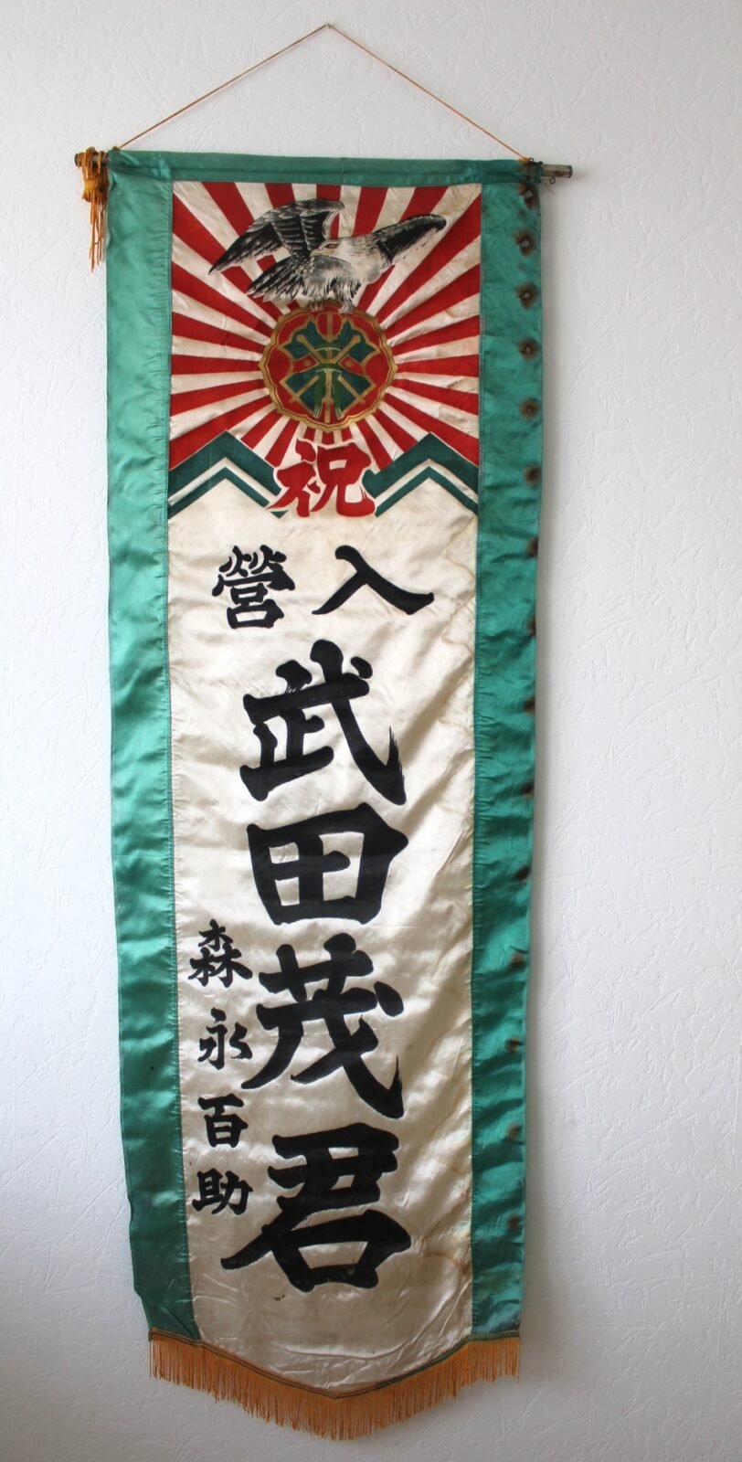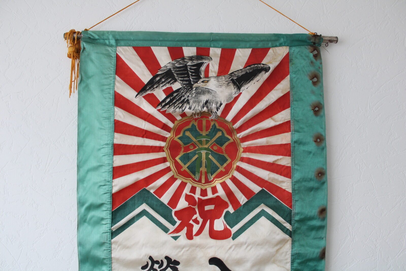 Original and beautiful large Off-to-War banner, still functional to be hanged on a wall, featuring the Golden Kite. This “Off-to-War” banner was made by friends of the man congratulating him being drafted into the army. Except for the stains and small holes in the upper right corner, still in very good condition. Comes fully translated.