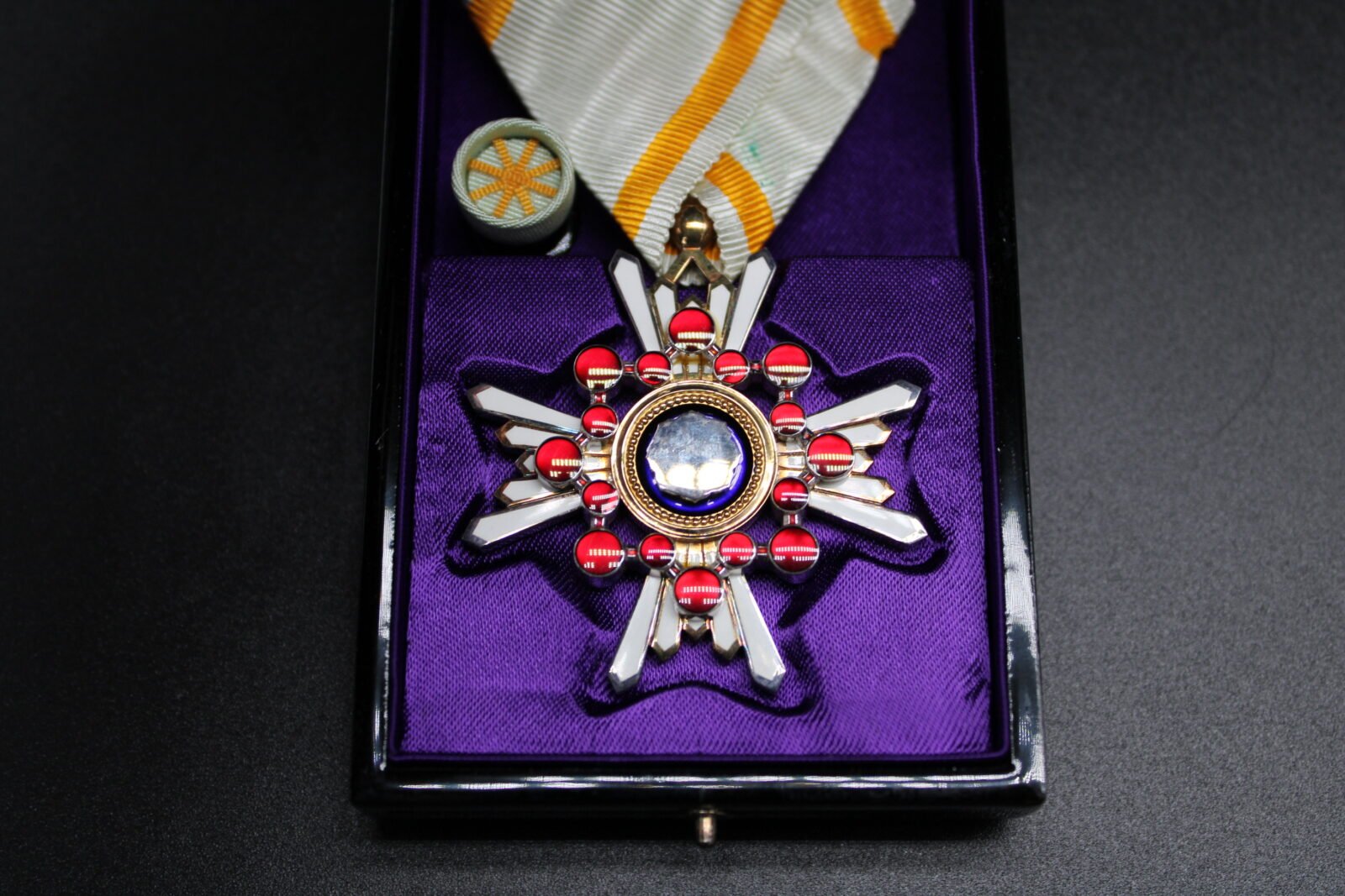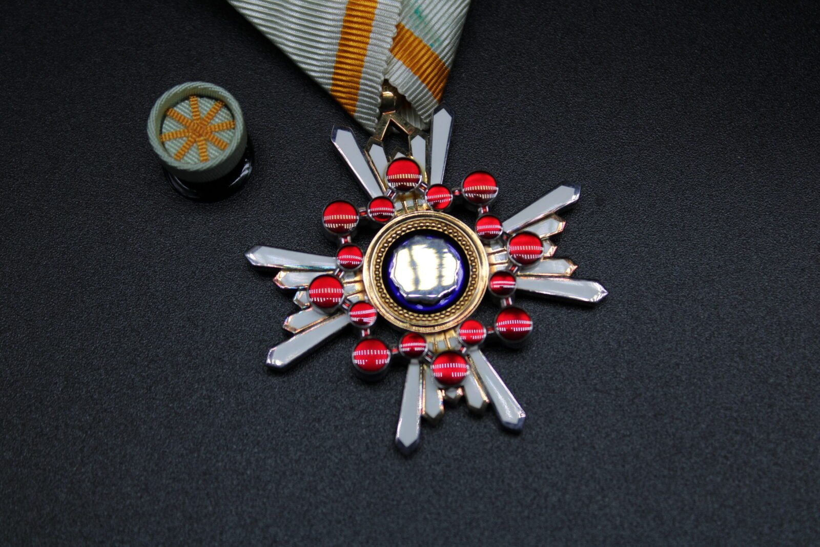 Original Japanese Order of the Sacred Treasure 5th Class. Original medal with matching casing, with golden lettering, in overall very good condition. Complete with rosette.