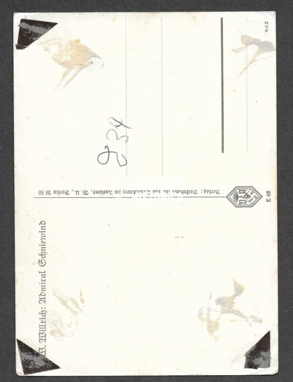 Autographs of Kriegsmarine Generaladmirale are highly desirable, particularly those tied to decorated figures such as Schniewind, whose career spanned both world wars and included a Knight’s Cross award for his key role in early naval operations. This original wartime-signed postcard is a scarce and valuable addition for collectors of Kriegsmarine history, Knight’s Cross recipients, and senior German naval commanders.